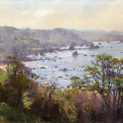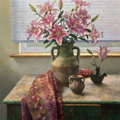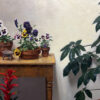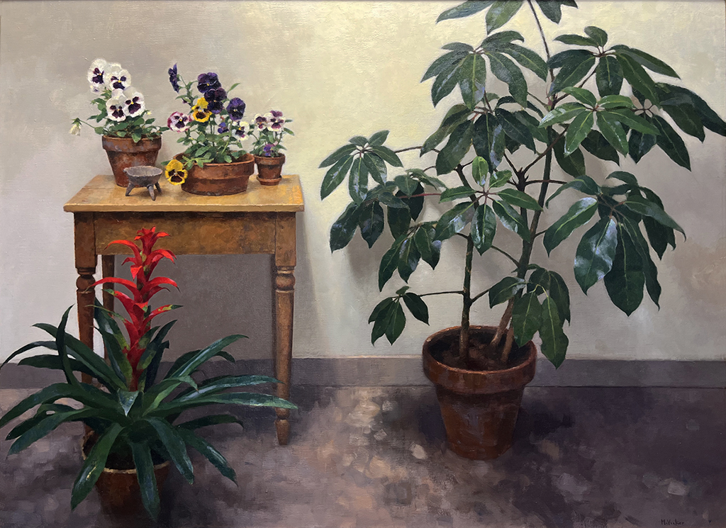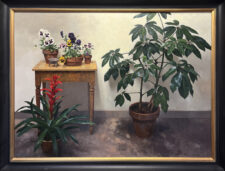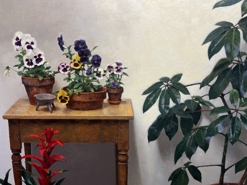 "I’ve always found the bromeliad plant a very beautiful and unusual plant. In this work I liked the idea of looking through it to the pansies. The pansies seem to look back at the viewer and set up a nice rhythm. The large plant carries the green foliage through the right side of the painting and has a spatial sense as the light and air move throughout the room."