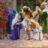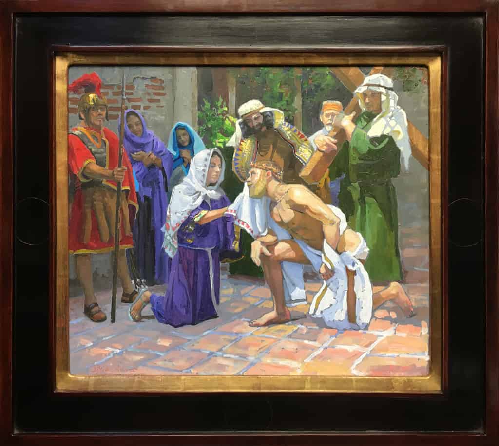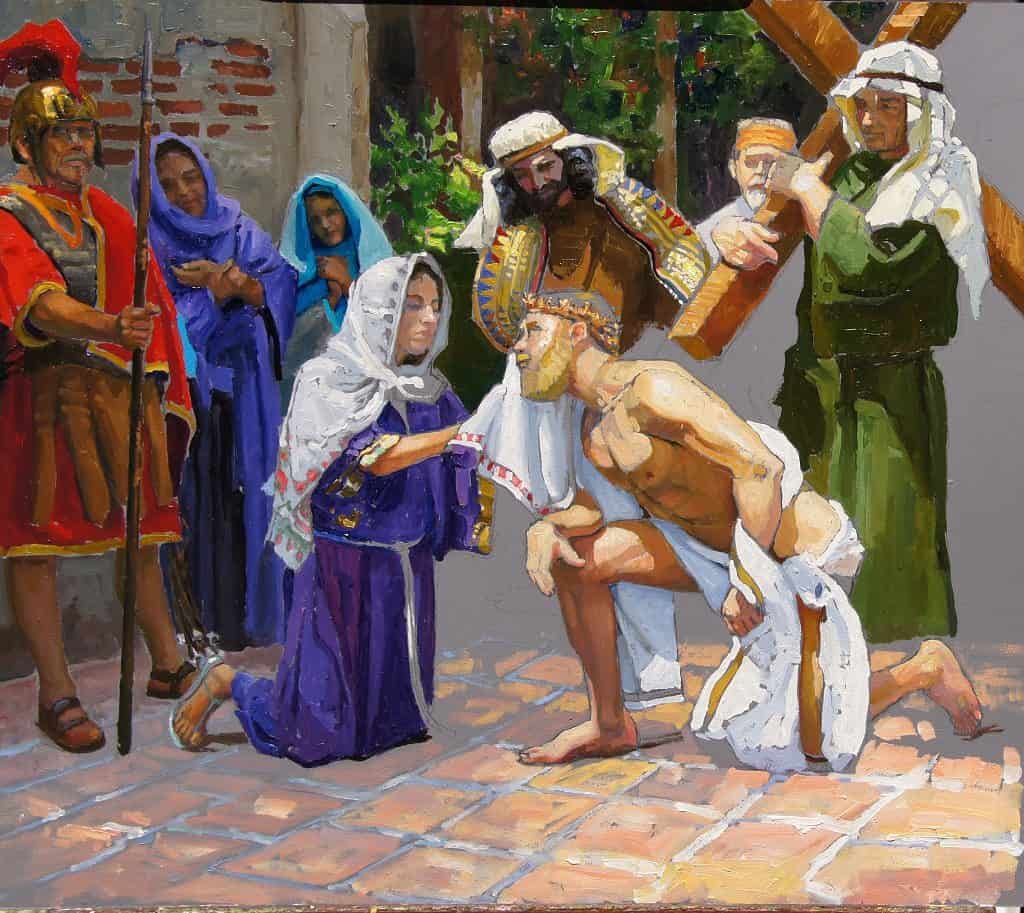 As Veronica wipes the face of Jesus she receives from the impression the image of Christ’s face on a cloth. The scene reminds us of the sixth Beatitude: “Blessed are the pure of heart for they shall see God.” The word Veronica may actually have originated to mean the true image of God. Vera meaning true and icon meaning image.