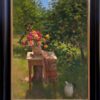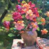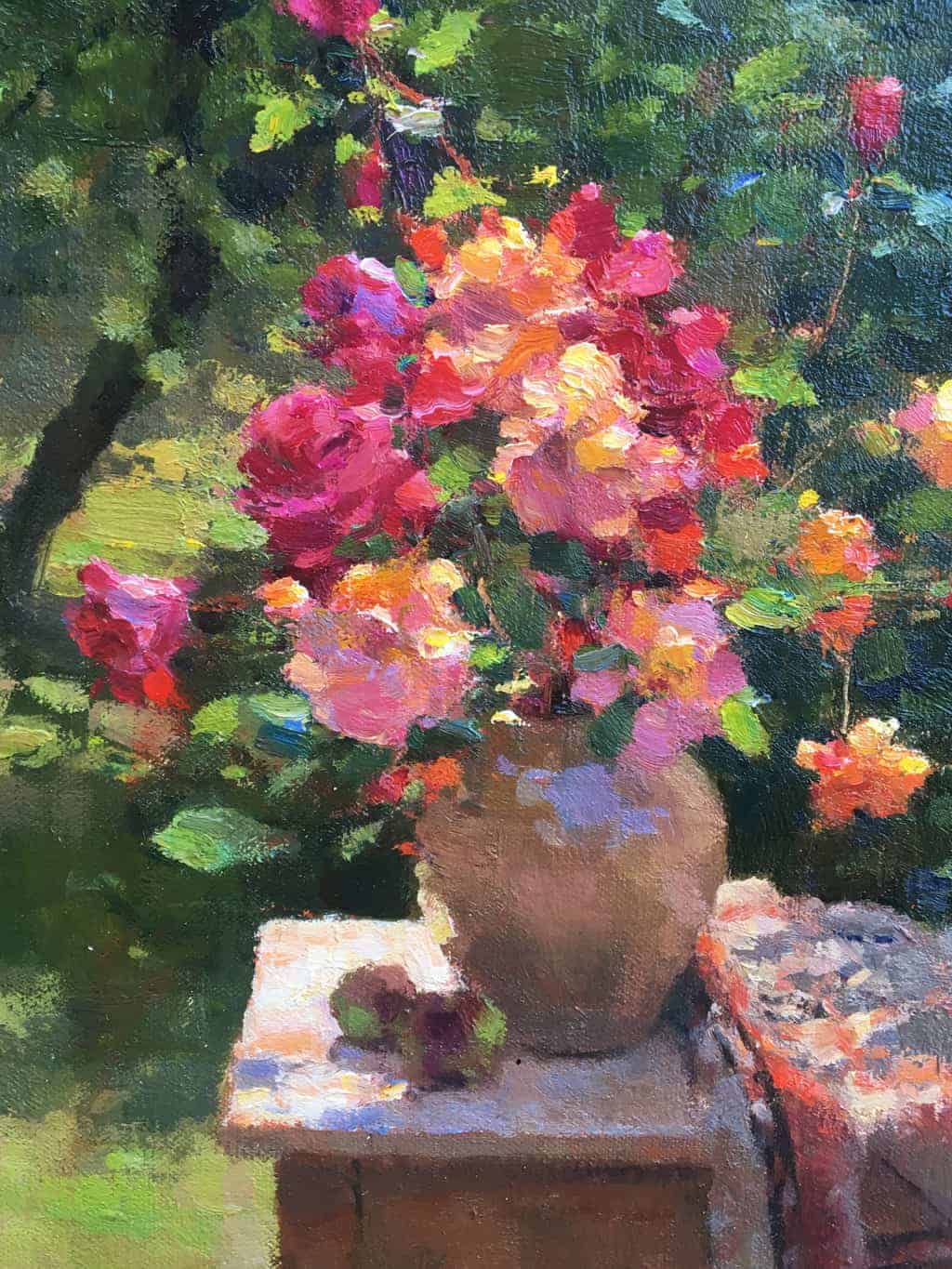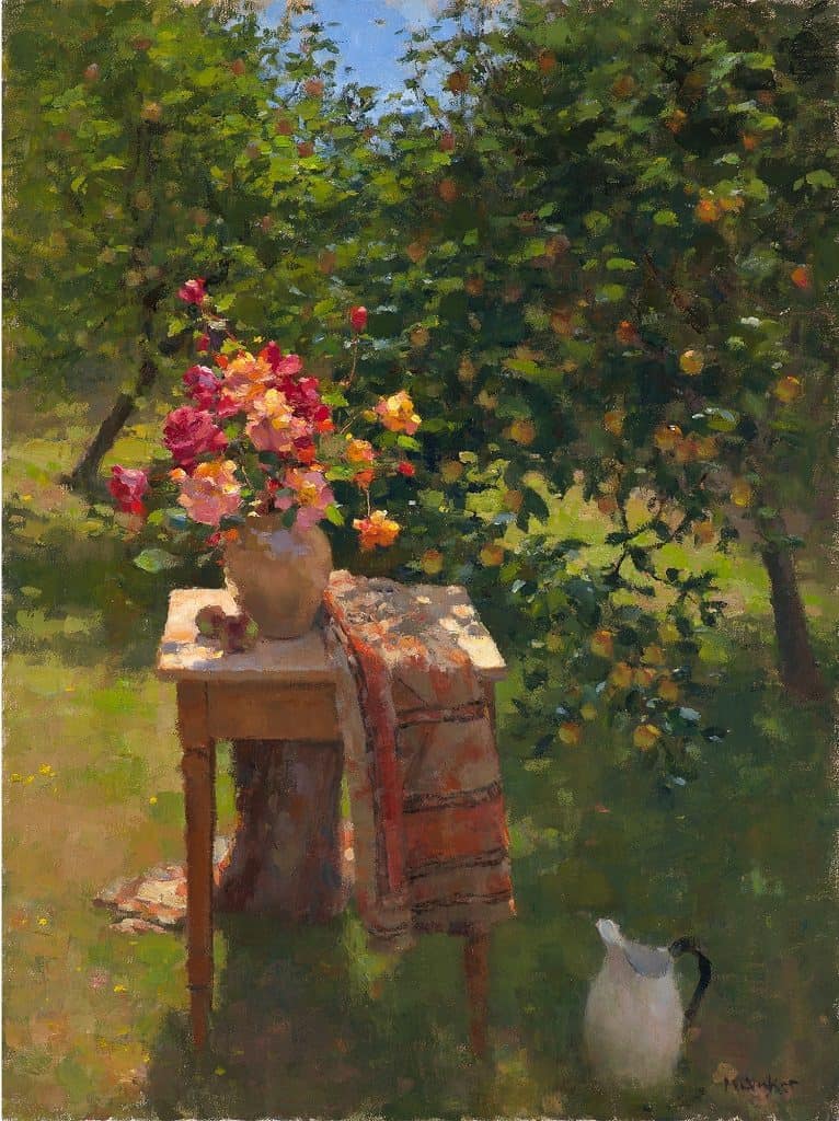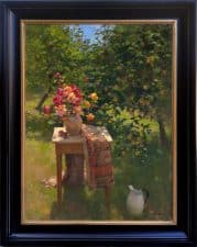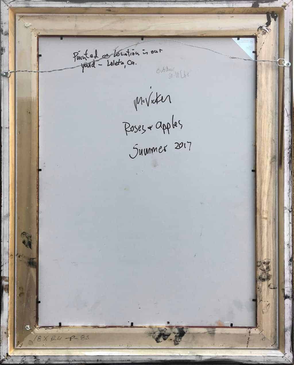"Every late summer and early fall our small apple orchard in our yard brings an abundance of fruit and beauty. The summer roses are in full bloom, so the idea struck me to bring the still life into the yard and combined two things I love to paint."