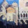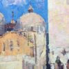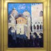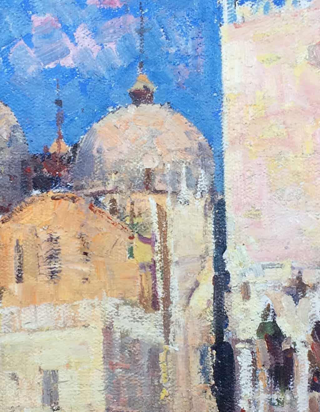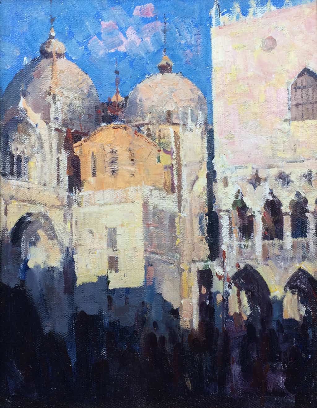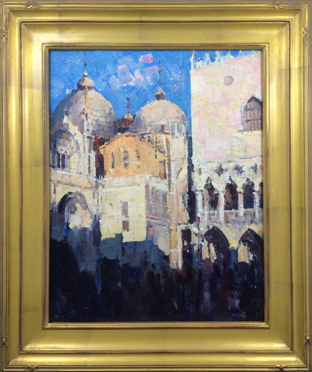 One of the most famous and recognizable tourist attractions in the world, St. Mark's Square in Venice, Italy, is where people gather to see and be seen. Referred to by Venetians simply as "La Piazza" (the Square), this location is steeped in centuries of history, political intrigue, and romantic interludes. With this painting, Jove Wang brings a feeling of mystery by emphasizing shadows cast by the surrounding buildings while the setting sun illuminates St Mark's Basilica and the neighboring Doge's Palace. Wang's immediate and painterly approach conveys the artist's spontaneous response to the scene.