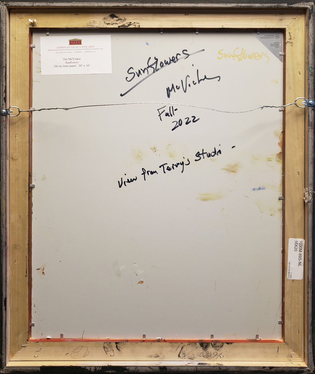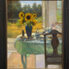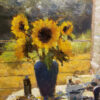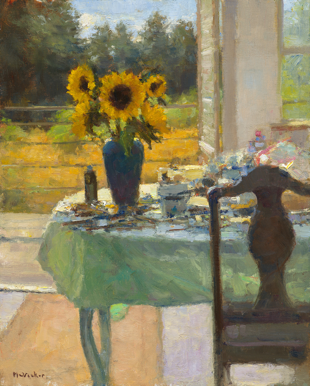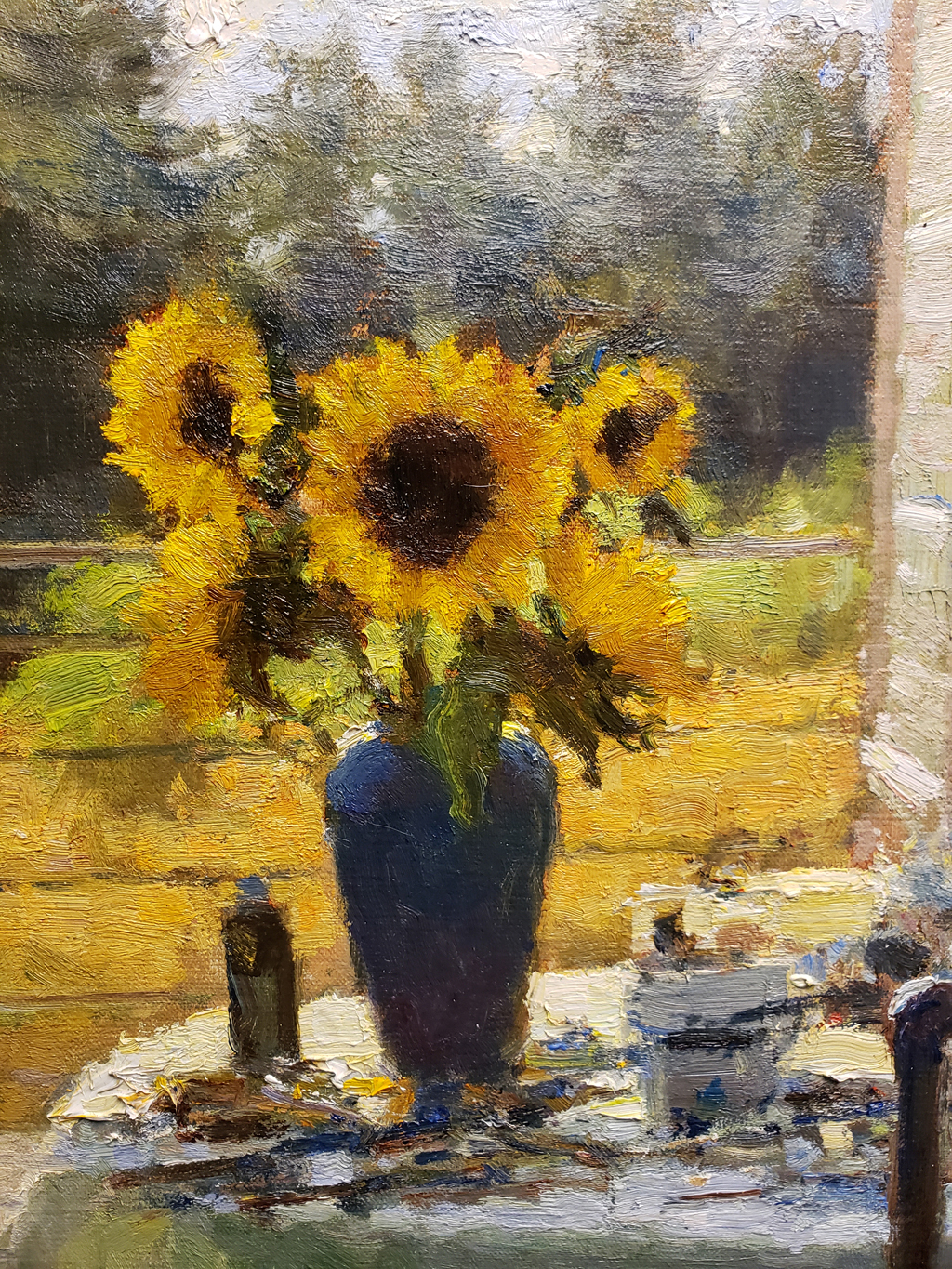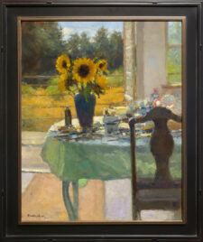 “This painting was conceived while I was in my wife’s studio and she had the doors open to the outside view looking west. I was so struck by the entire scene, the outdoors and indoors seemed to be intermingling with one another. I immediately thought of setting sunflowers on the table and painting the scene bathed in the afternoon sunlight in a contre jour effect.”