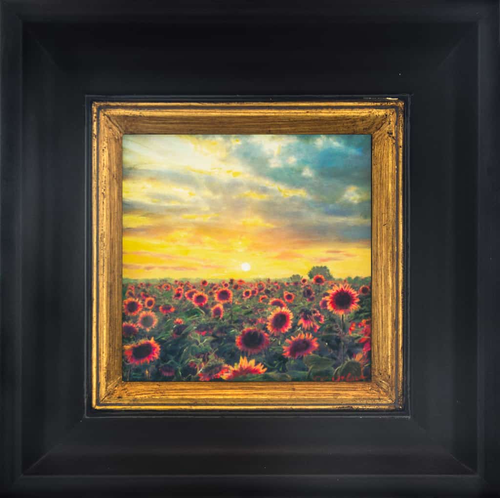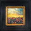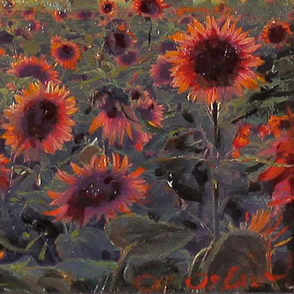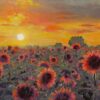 The painting depicts a beautiful field of sunflowers in Ukraine at sunset. Tender petals of sunflowers that picked the rays and warmth of sun, are reflecting orange tint of the last rays of it.