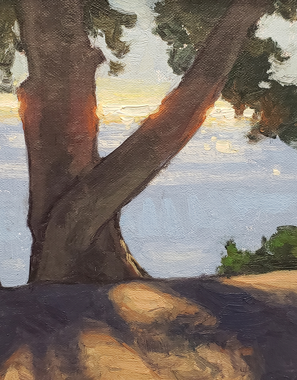 "I painted this scene during a California Art Club paint-out with a group of artists from the Santa Barbara and Ventura/Malibu chapters. I chose this scene to explore the range of contrast in this kind of backlit light effect. The camera can’t capture this kind of contrast the way the human eye can."