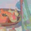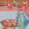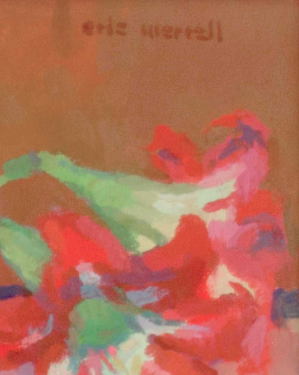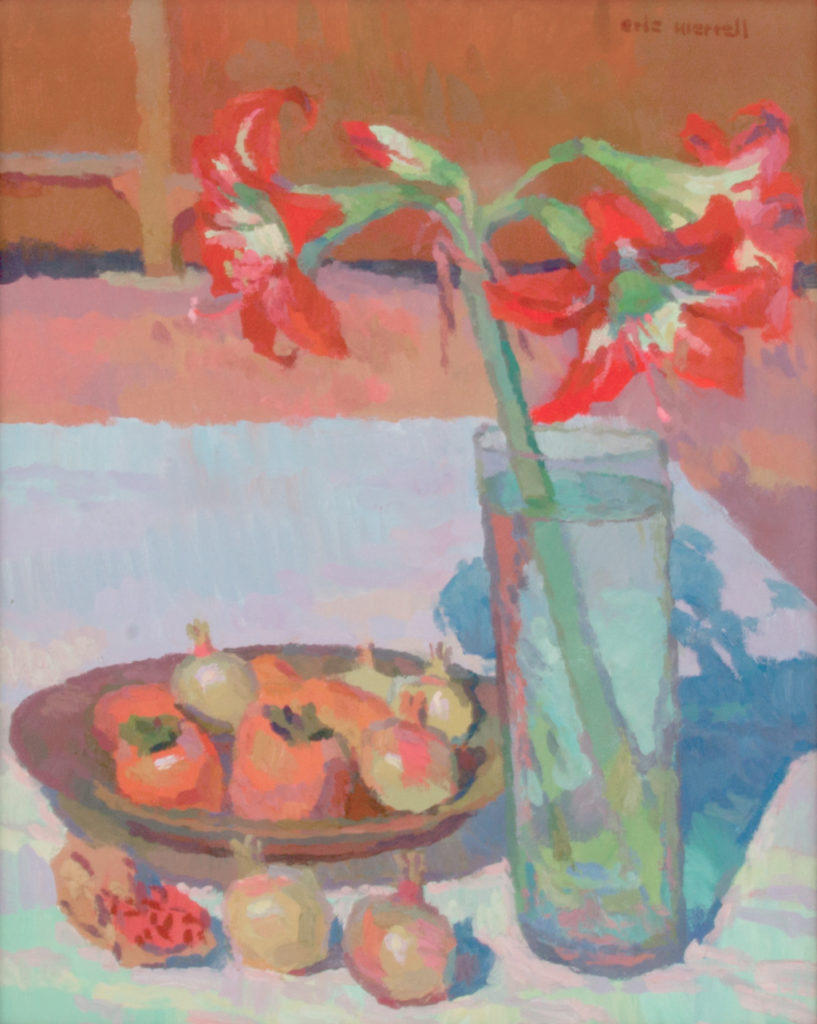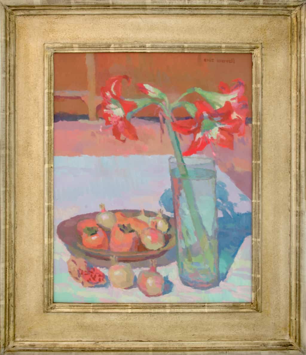 Although titled Thanksgiving, Eric Merrell has not given us a traditional display of Thanksgiving food that one has come to associate with the holiday. Instead, the objects pictured are other products of November: persimmons, pomegranates, and amaryllis. This painting has great personal meaning to the artist; all of the plants depicted were planted in the house that he and his wife, Ramona, had lived in for several years. The deep family connection found in this scene, along with the spirit of giving and life, connect together to create an untraditional, but highly meaningful, portrait of Thanksgiving.