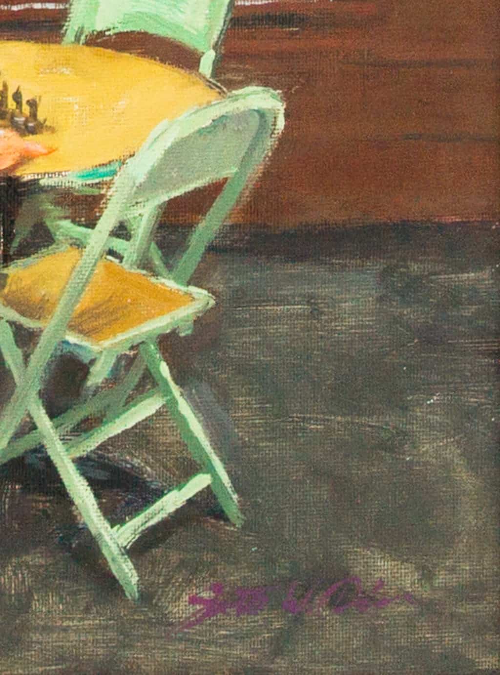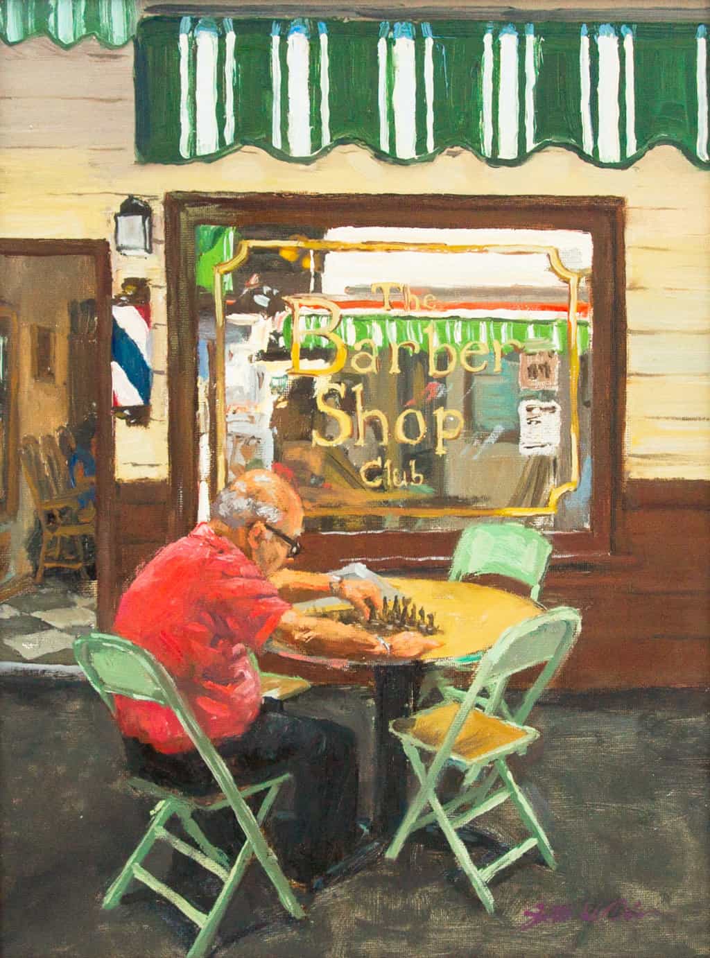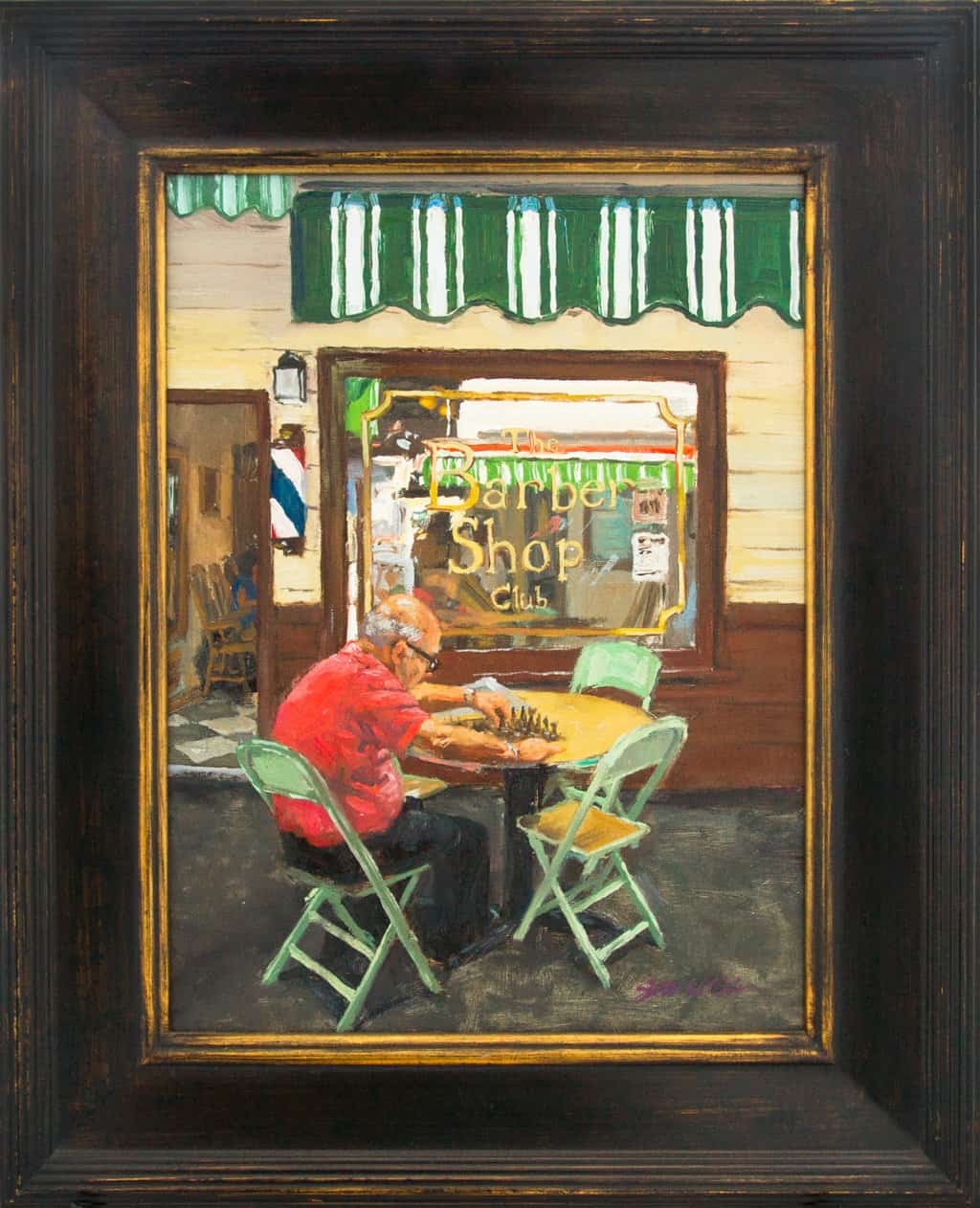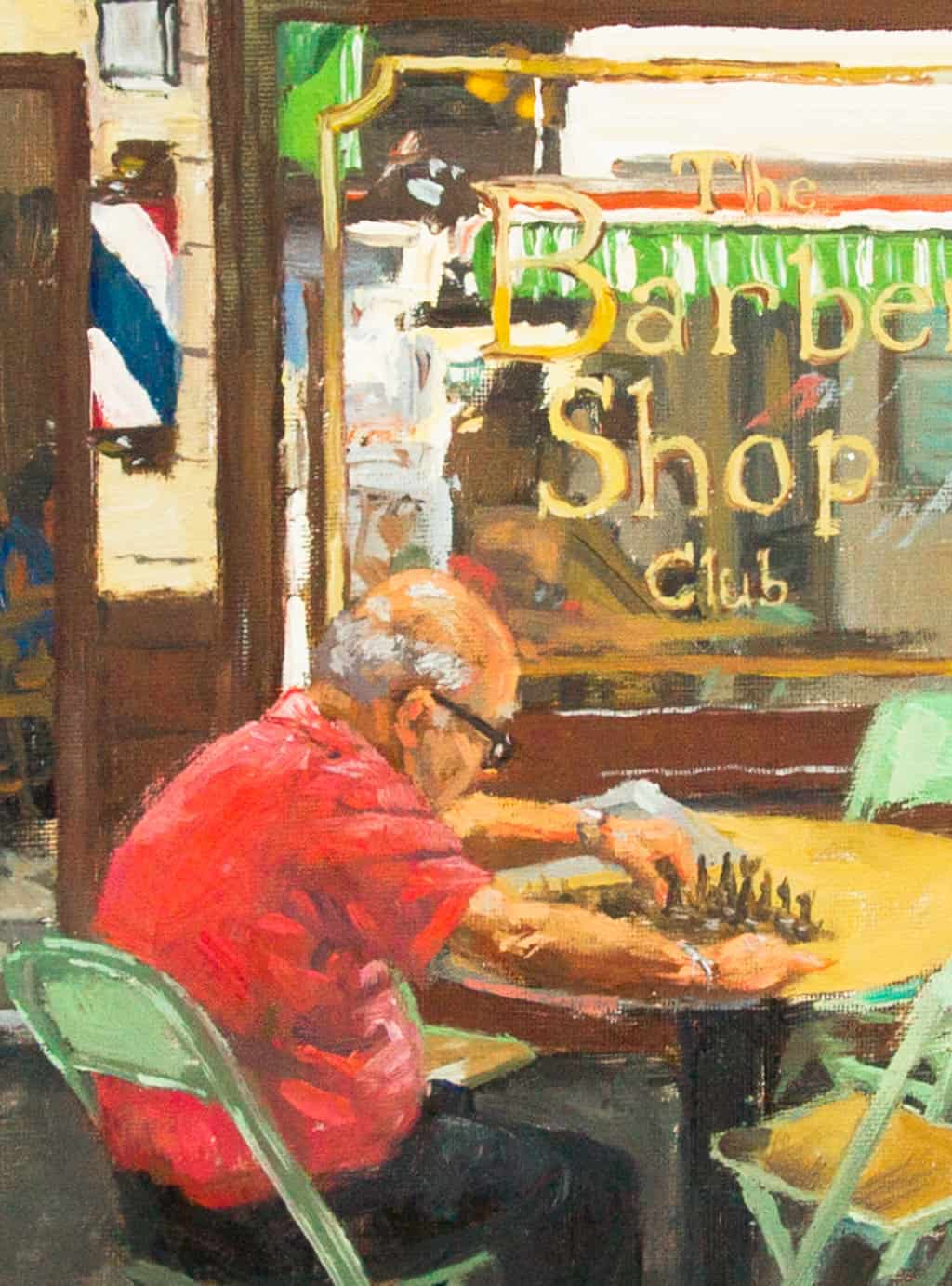 During the daily hustle and bustle at the Original Los Angeles Farmers Market, whose motto is "Meet me at Third and Fairfax," one of the regulars relaxes in front of The Barber Shop Club to play a solitary game of chess. Founded in 1934, Farmers Market continues to attract Hollywood celebrities and tourists. Prior's painting portrays a sense of modern Americana.