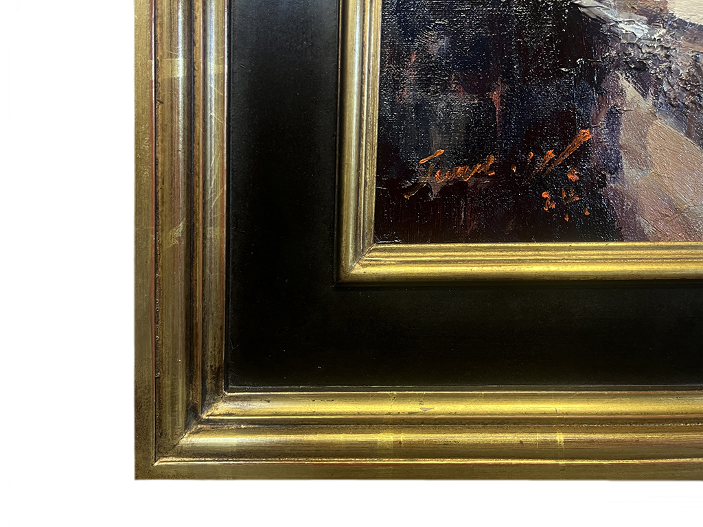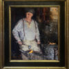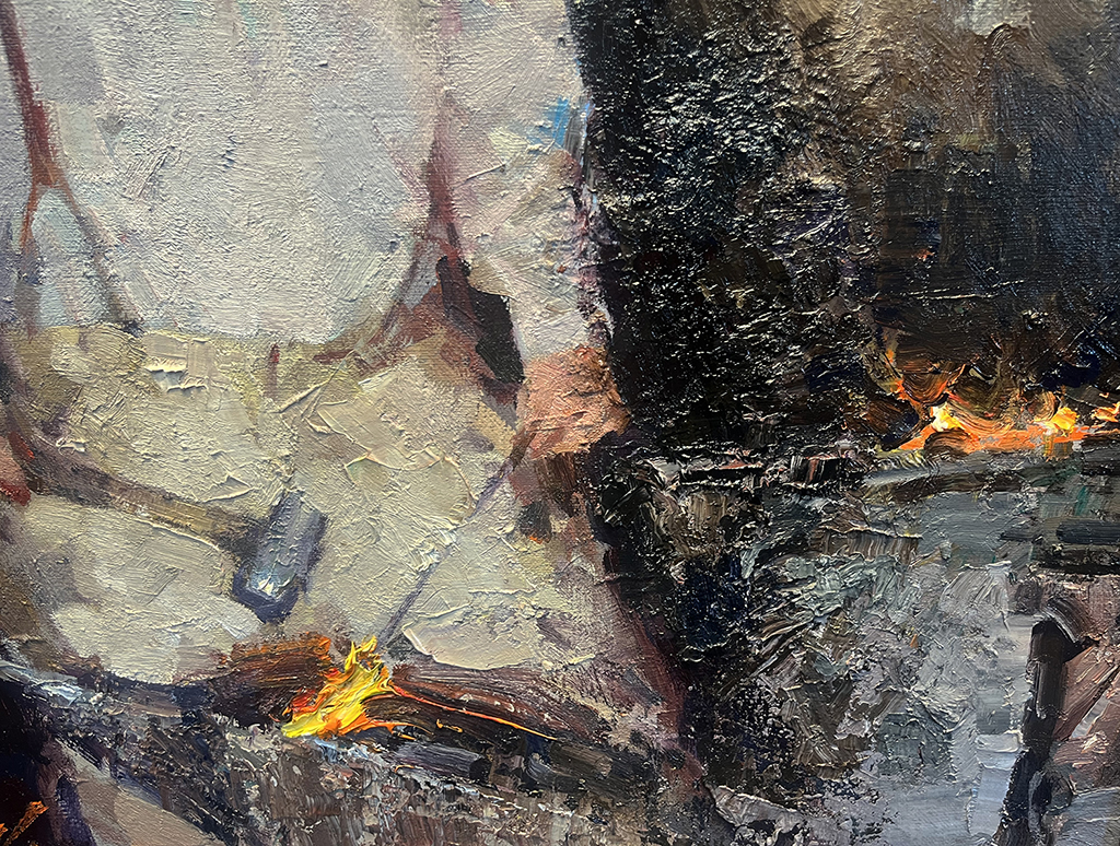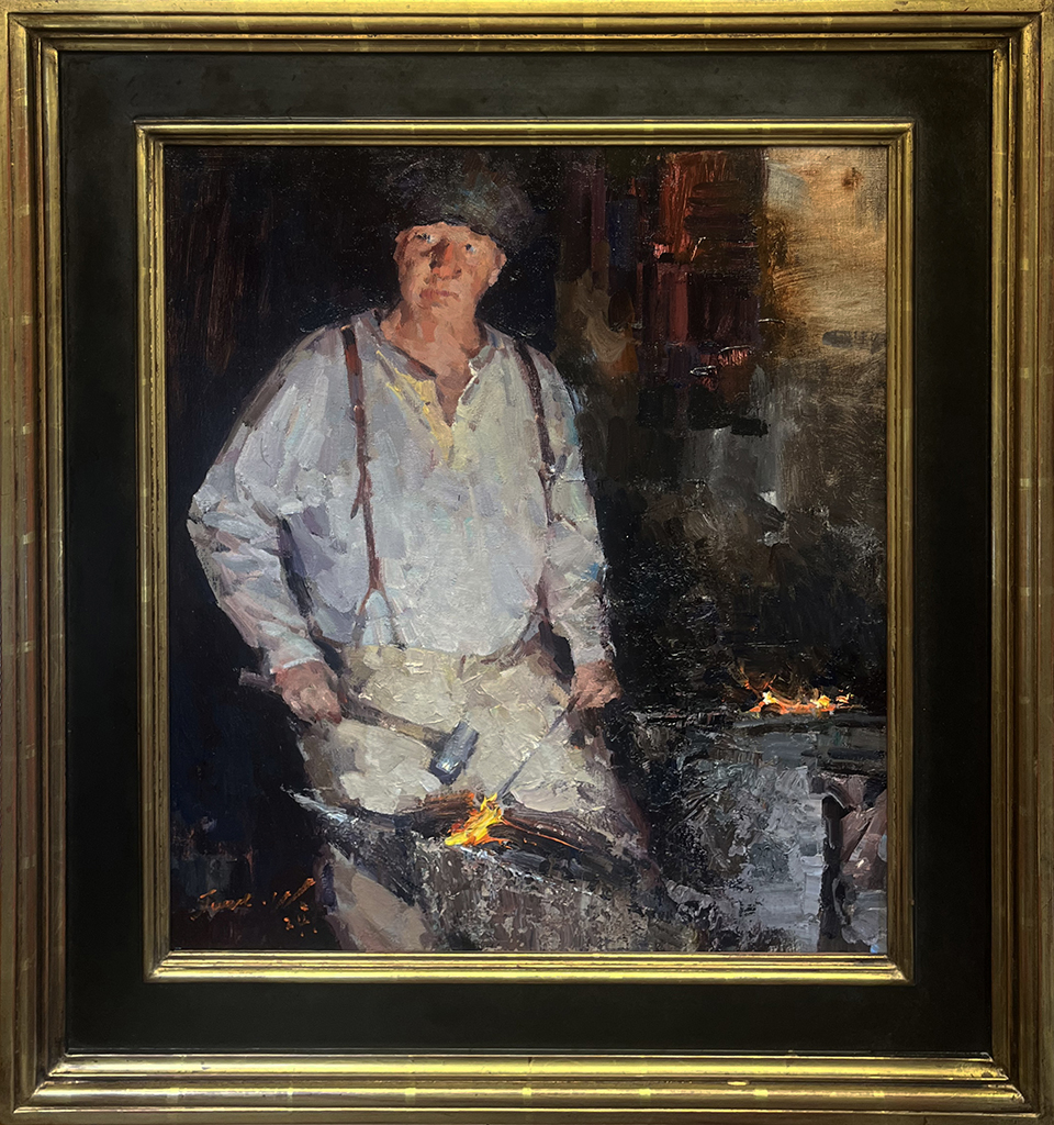 “This painting captures a vivid slice of rural Western life, showcasing the blacksmith’s dedication and resilience as he hammers away at hot iron. Surrounded by glowing embers and iron stoves, the scene conveys the rugged reality and self-reliance of his trade. The classical color palette, with its transparent dark tones and harmonious blend of black, white, and gray, unifies the composition and enhances its depth.”