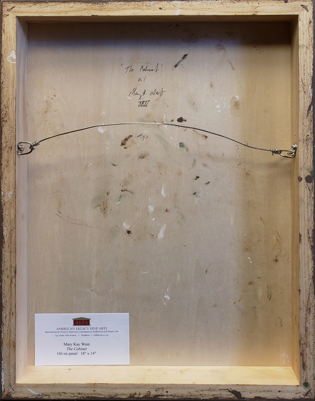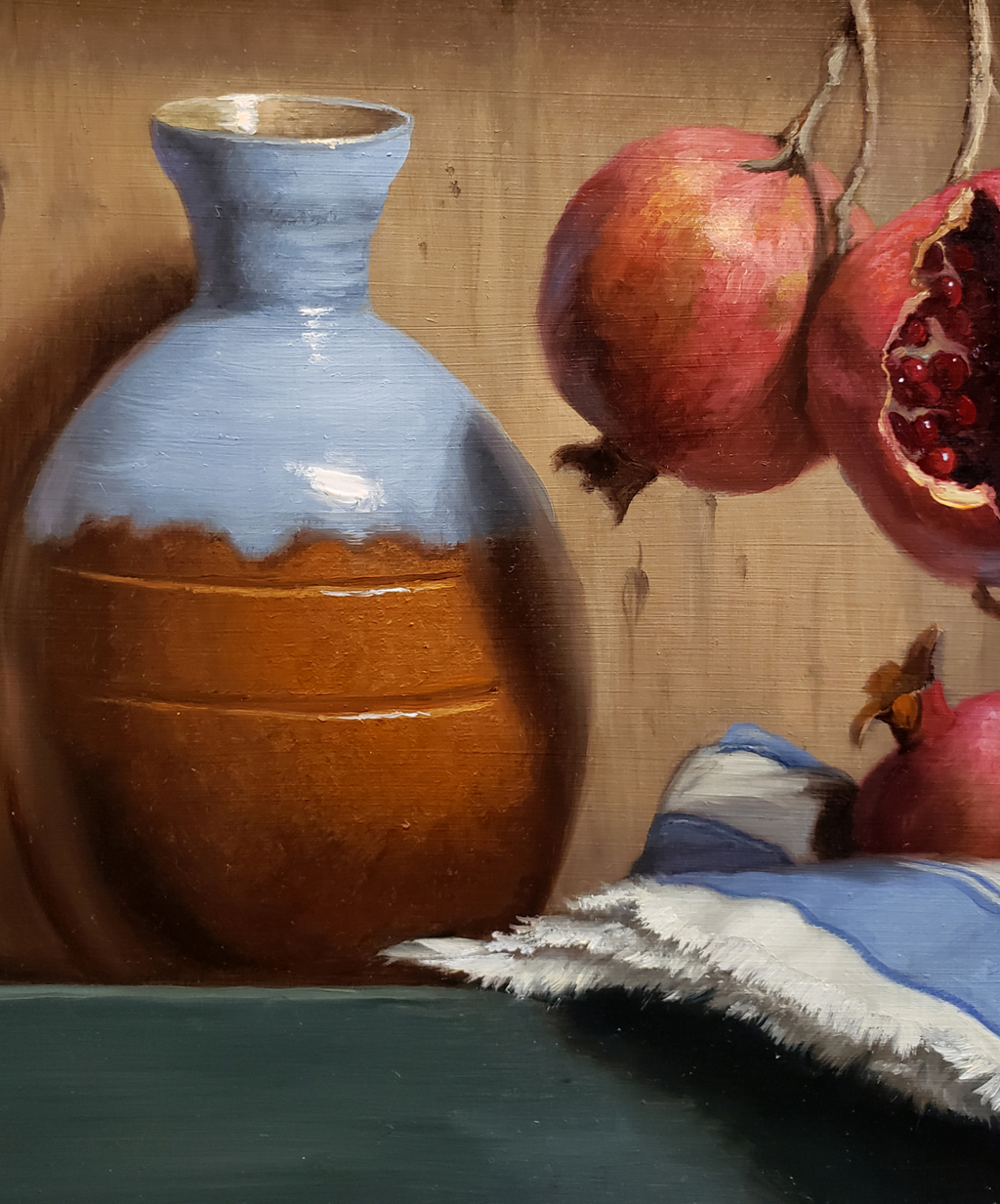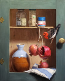 “I particularly enjoyed painting‘The Cabinet’ as an homage to the tradition of trompe l’oeil, or ‘fool the eye’ paintings. The genre is deeply rooted in the classical realist tradition and this piece is conceptually and technically true to those roots. The use of a cabinet has always been a favorite of artists because it is such a relatable and familiar object. But technically it serves as a recess or inner space in which to describe the three-dimensional effect required of a trompe l’oeil. In this case the spices in the composition are from my own kitchen, the pomegranates from a neighbor’s tree, and the fabric from an old sewing project…all a part of my life even if in some small ways. The bird is a male Red Headed Fody, native to Madagascar and other islands in the Indian Ocean. He is included in the story not just to add life to the stillness, but as a dimension that is coming forward towards the viewer.”