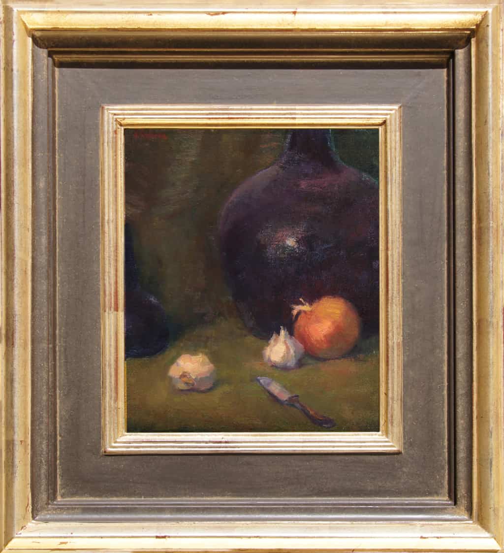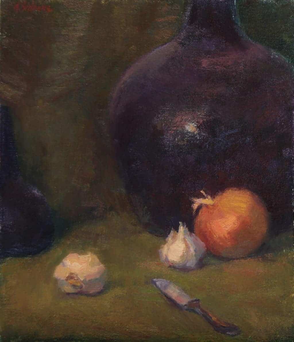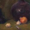 “Painting still-life allows me the time to savor with paint and brush my surroundings. Onion and garlic, albeit humble ‘objects’ offer appealing design and color arrangements. “When Moses led the Hebrews out of Egypt they complained of missing ‘the finer things in life’ - fresh melons, cucumbers, leeks, garlic and onions.” My intention was to make the ordinary important.”