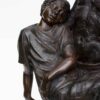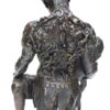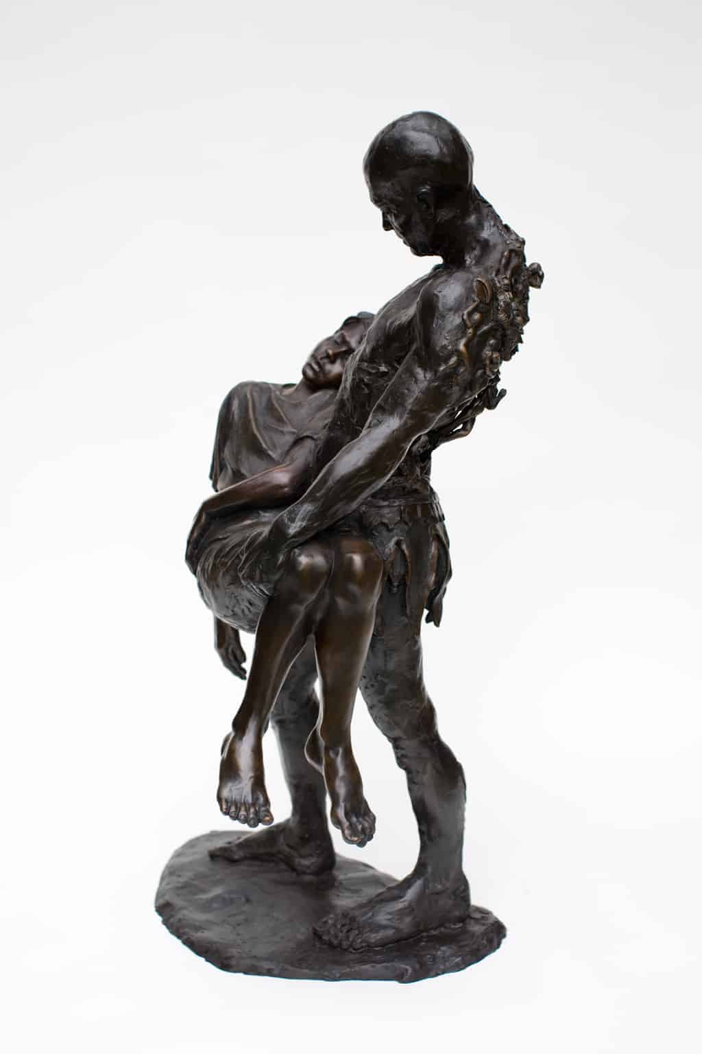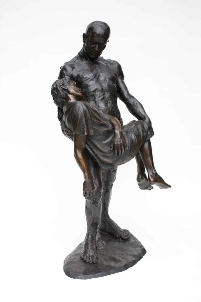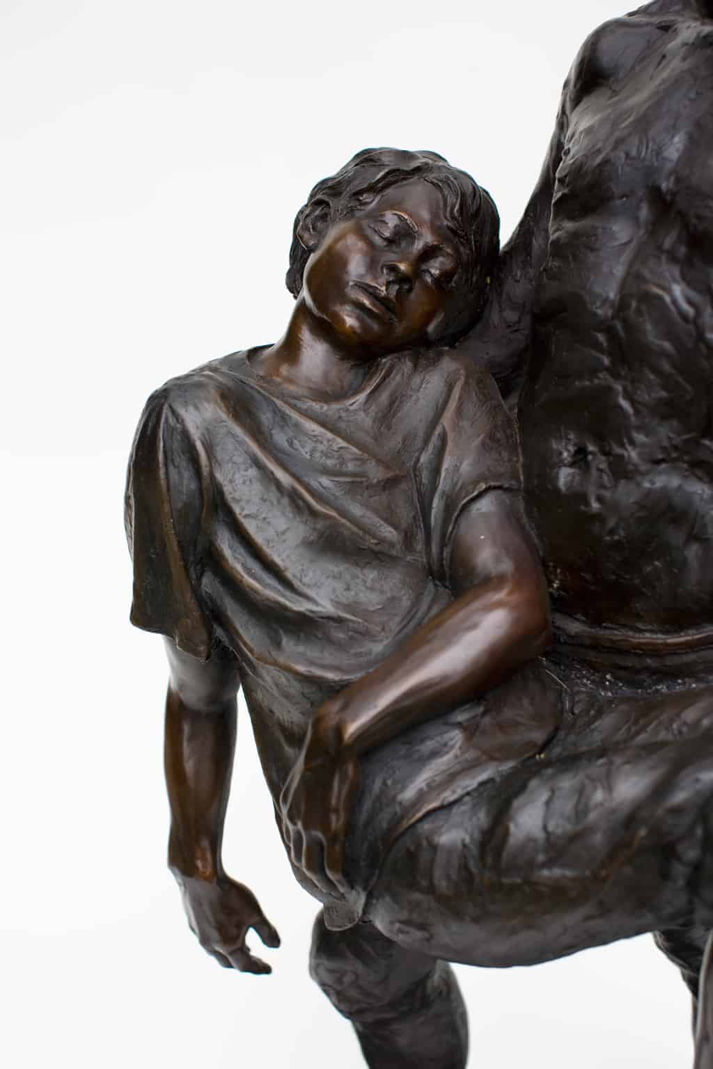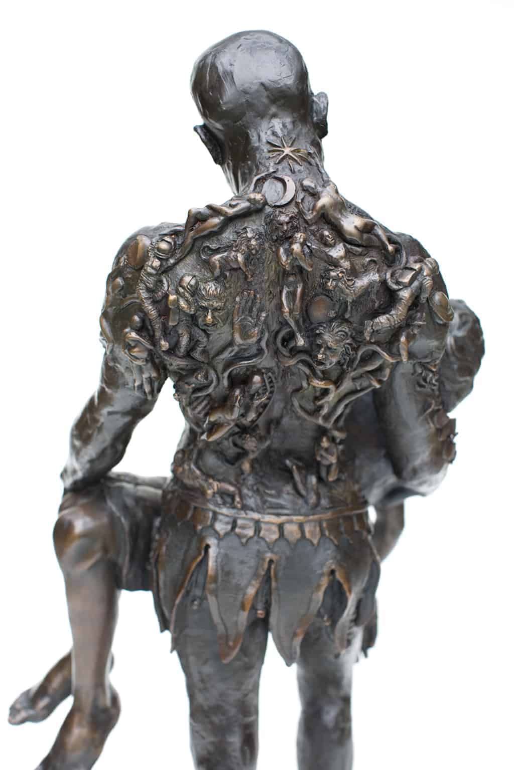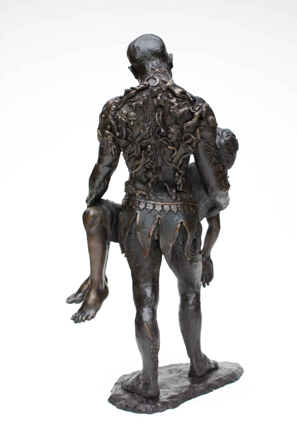 This sculpture depicts a father scooping up his son. This imagery reflects the final sleep of boyhood. The back of the sculpture references Ray Bradbury’s “Illustrated Man”, a character from his novel about a tattooed man who sweats, and, as a result, his tattoos come to life. The twisting figures in the back of the sculpture allude to Bradbury’s stories and showcase Slatoff’s remarkable imagination.