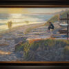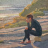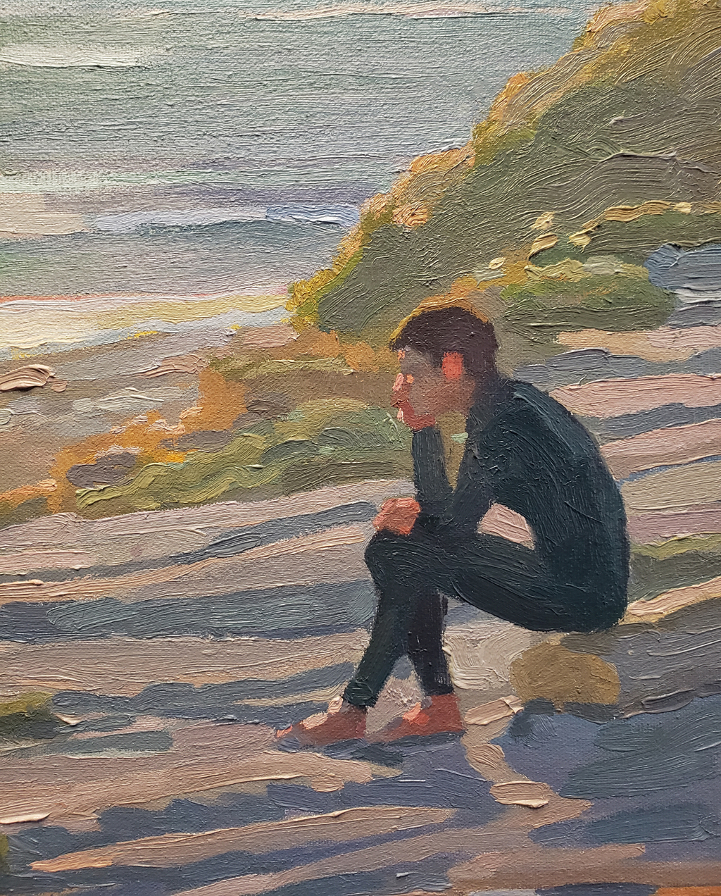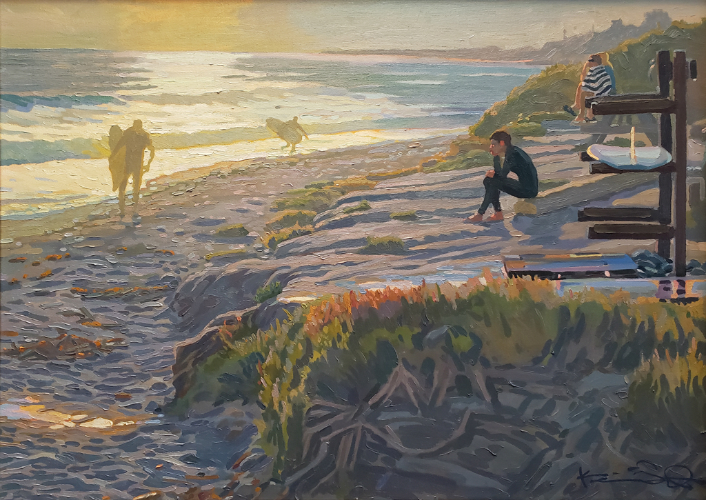 “This is part of my series, ‘Disappearing San Onofre.’ While down at San Onofre painting, I saw a boy teaching himself to surf. I noticed him come in after one too many mouthfuls of salt water. He took the time to wash the sand and seaweed off his board, but he was too tired to put away his board. He just sat down. Rather than trying to cover his crumpled pride through cussing and expletives, he sat, looked, and recovered, measuring his experience. It was heart lifting, in what looked to be defeat, he was not defeated, only disappointed—knowing he will try again. I could only smile. This kid had a rare kind of victory.”