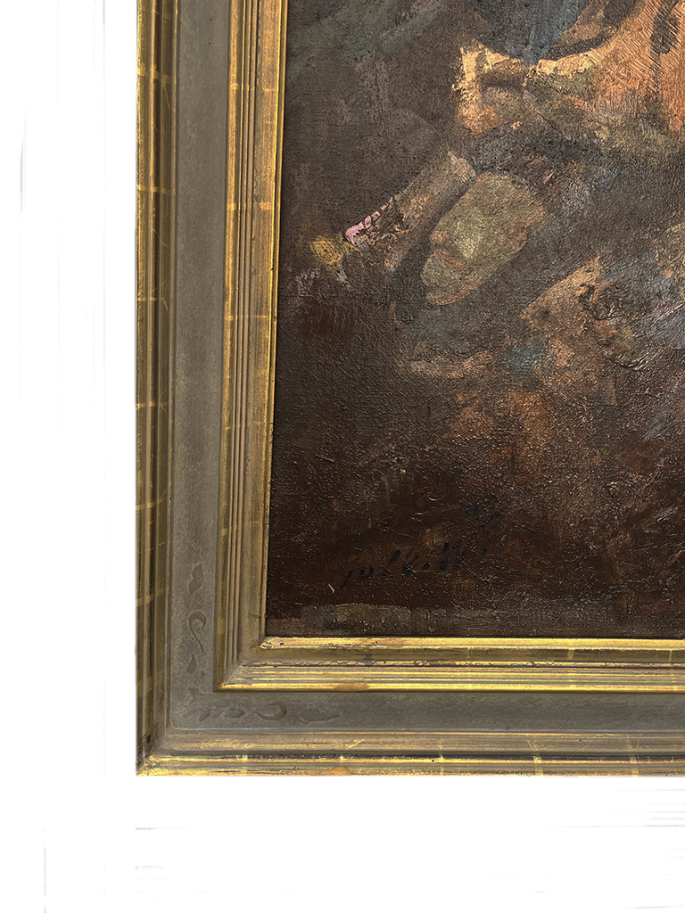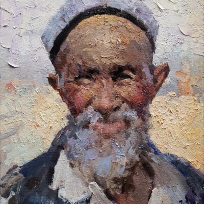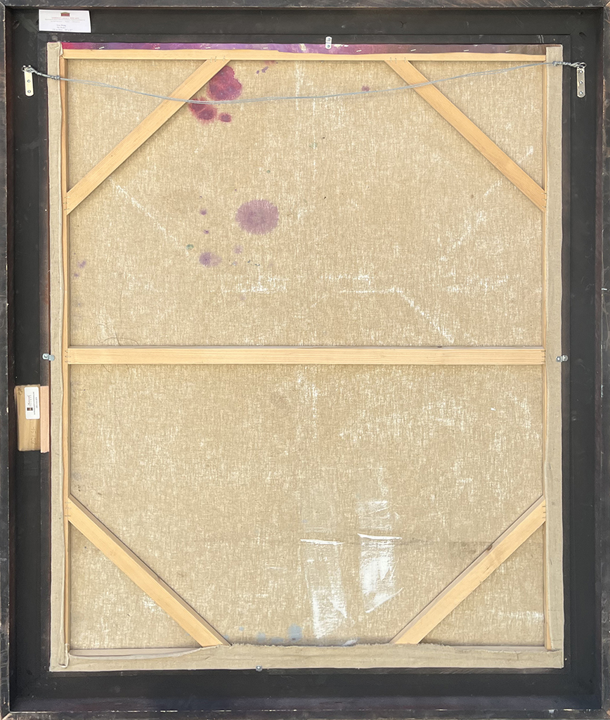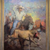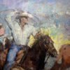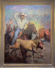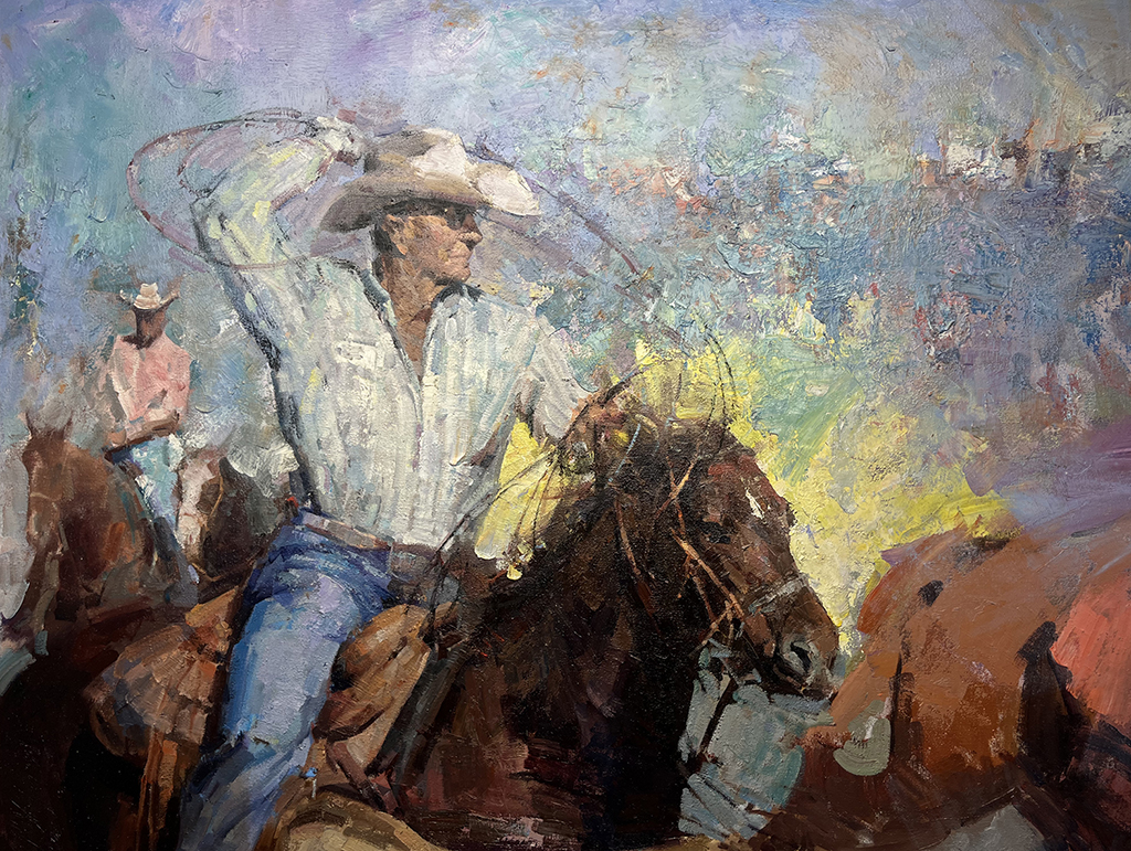 “The painting was created during a live rodeo, and shows the skills, energy, and wisdom of cowboys. The spirit and force of tension in the composition are highlighted by the overall design and rhythm of movement.”