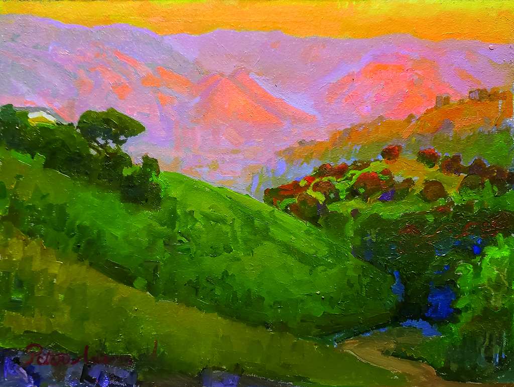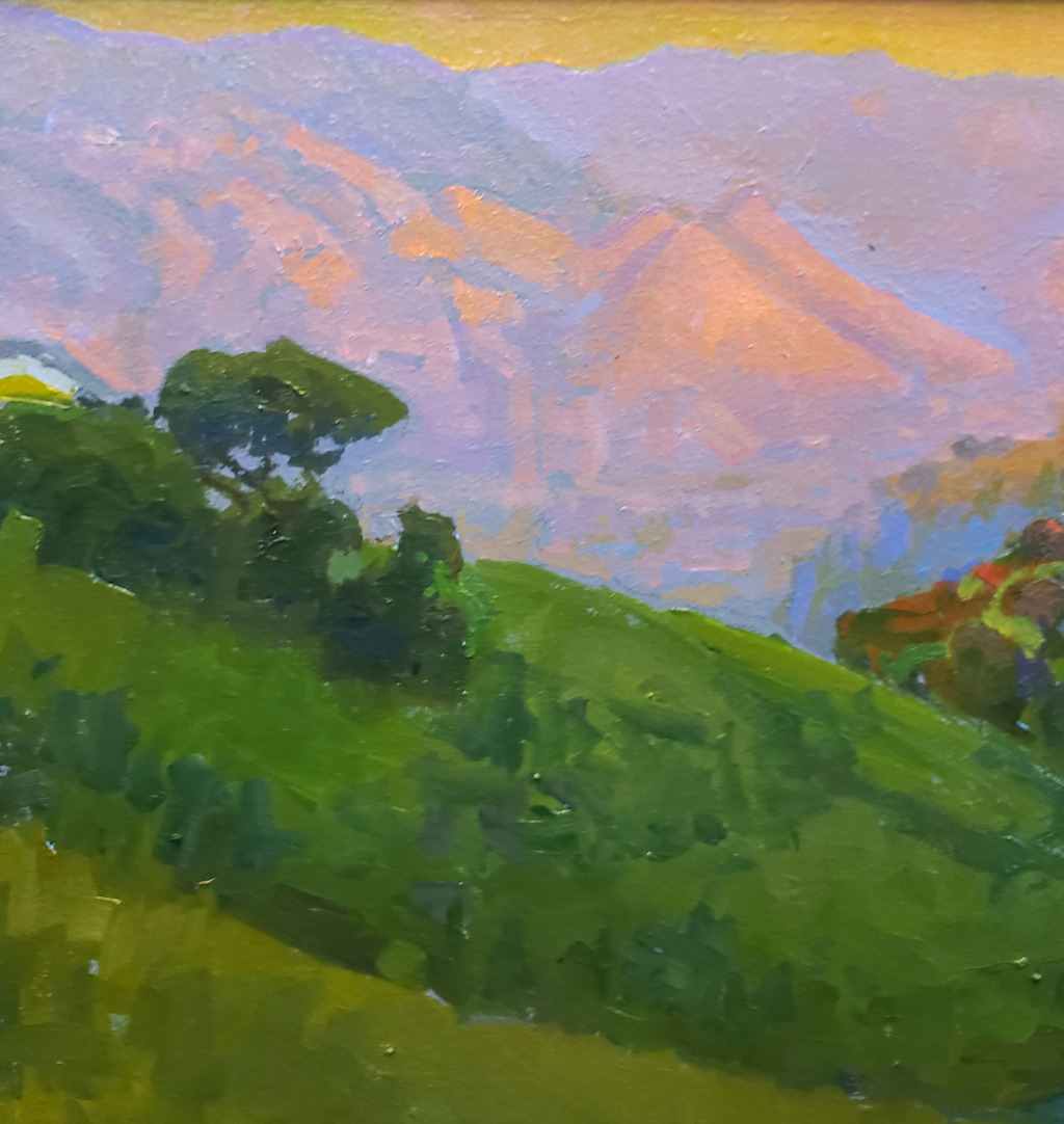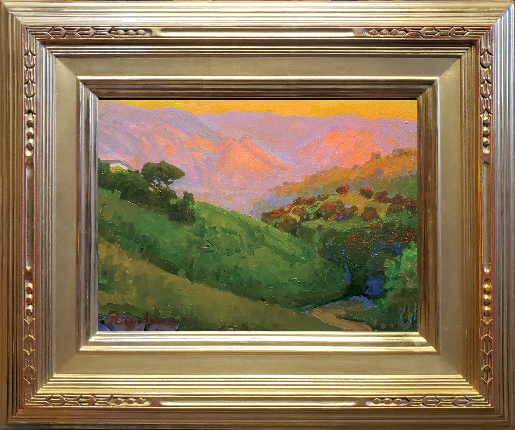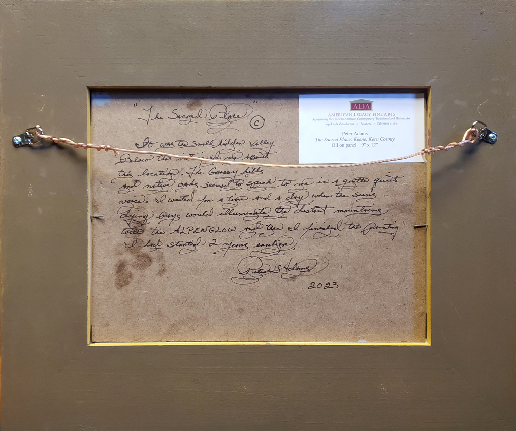 “As I stood on a hill above a secluded glen looking towards the east, I saw the Tehachapi Mountains bathed in an Alpenglow. A deep sense of reverence washed over me as I witnessed the reddish tones of the mountains in the distance complemented by the deep greens in the small hidden valley below. The interplay of light and shadow, the vibrant hues painting the mountains, and the quiet stillness of the surroundings coalesced into a moment of divine harmony. I sought to convey this profound sense of awe and spiritual connection in my painting and to invite the viewer to contemplate the sacredness of nature's quiet places.”