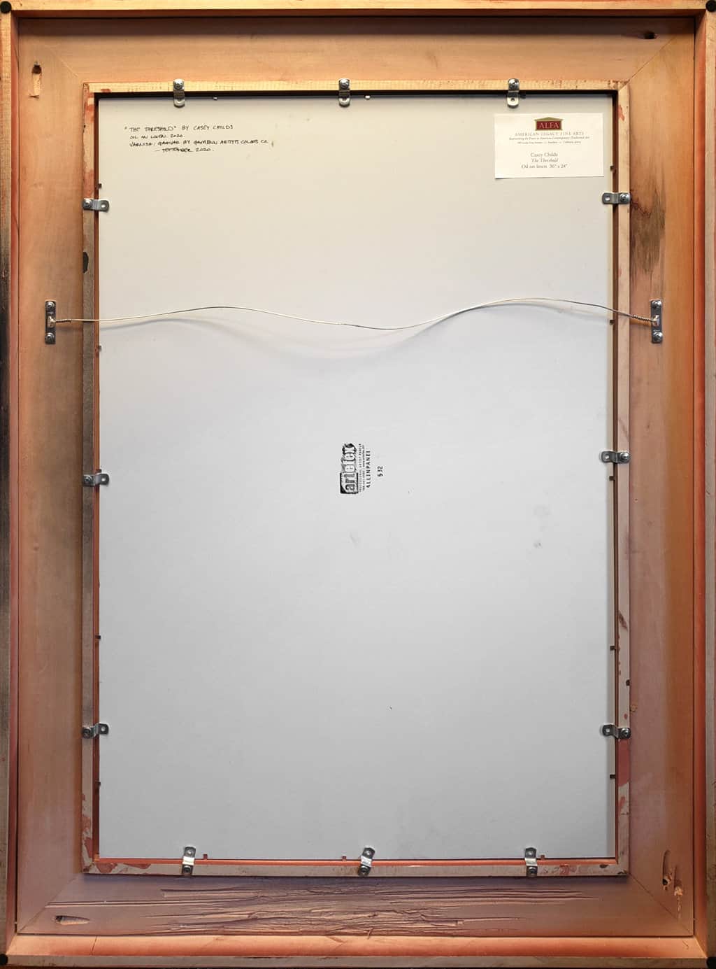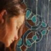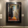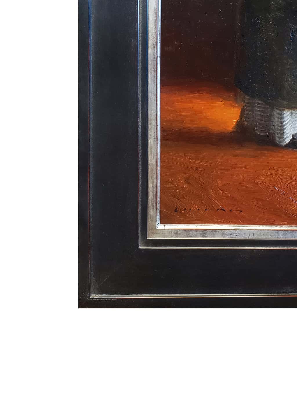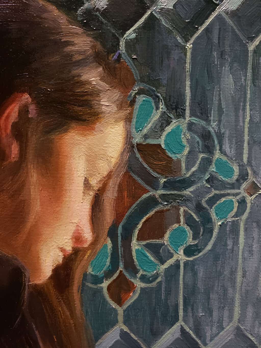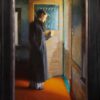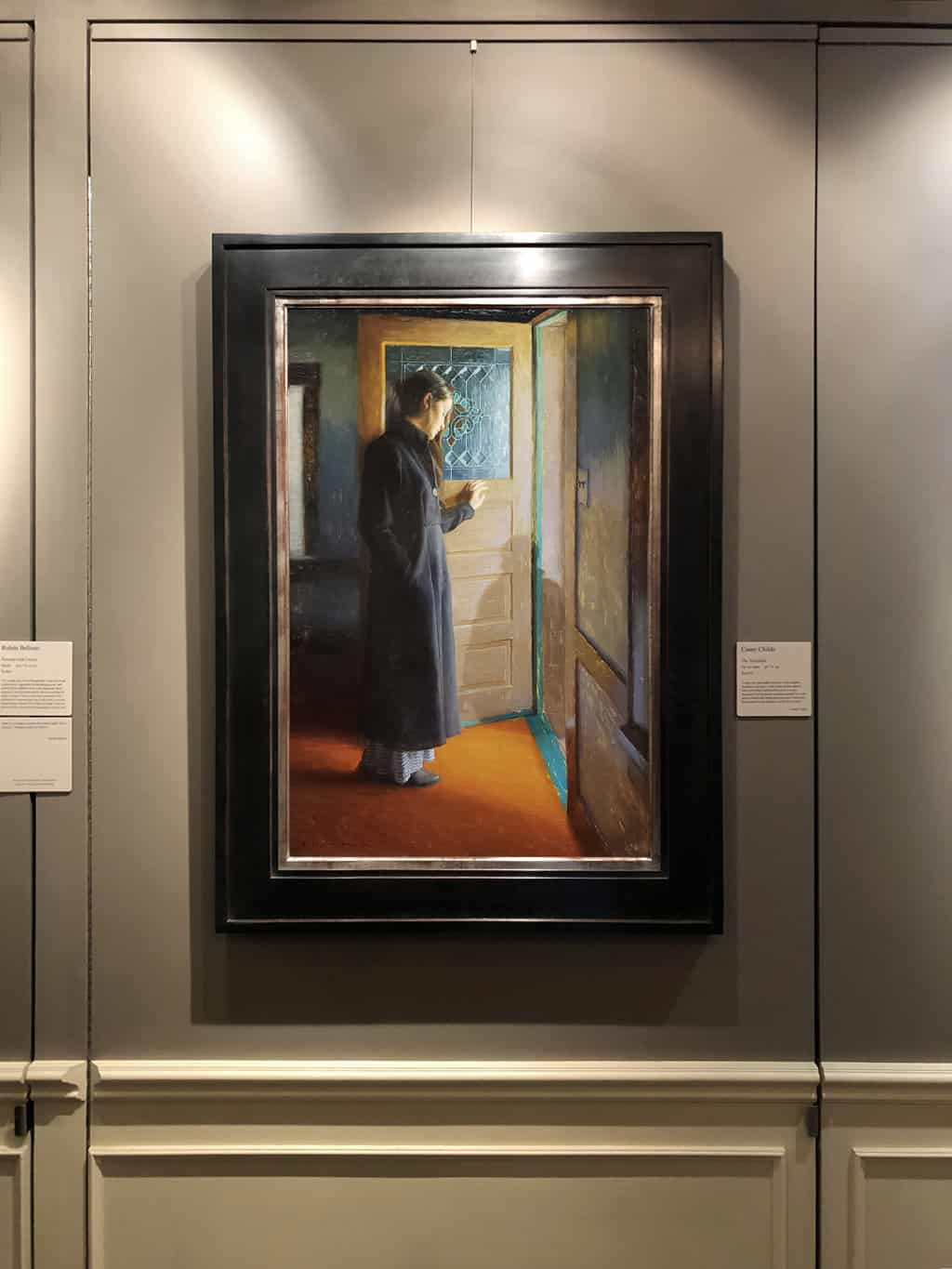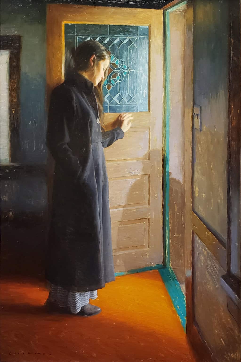 “I enjoy the open-ended narrative of this painting. Standing at the door, is this young woman about to leave everything behind and move on to a new beginning with the person standing outside? Or, is she staying behind and letting that person go? Either way the threshold of the decision is up for her to cross.”