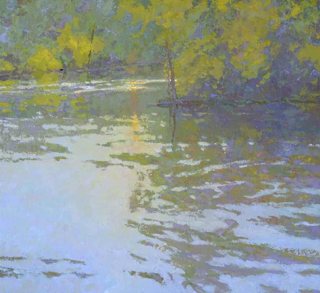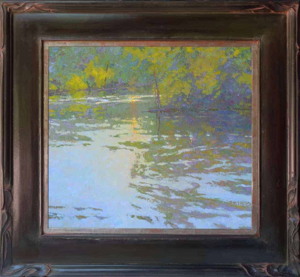 “It is the essence of a place that is at the core of my work. I often find that I am drawn to the intimate aspects of a landscape. Transcendence was inspired by the bold graphic shapes of the water’s reflective surface in contrast to the last light of day softly stippling the surrounding foliage.”