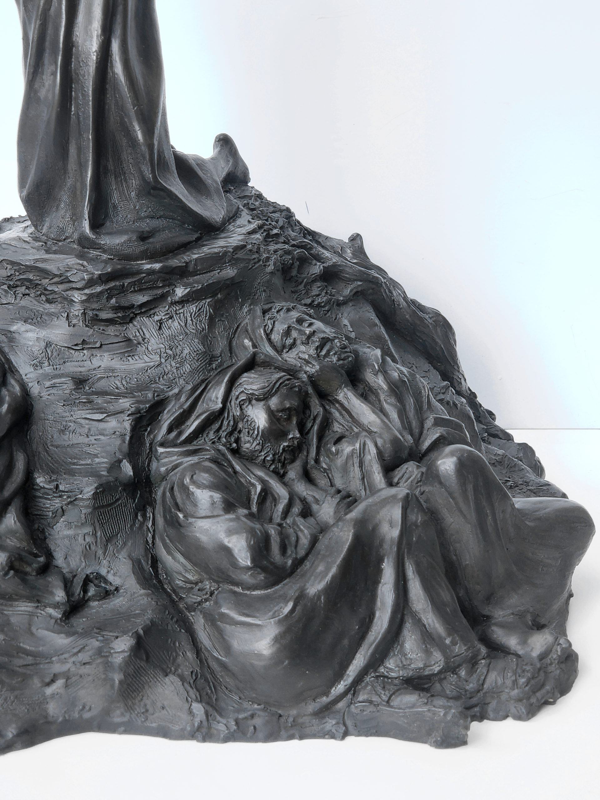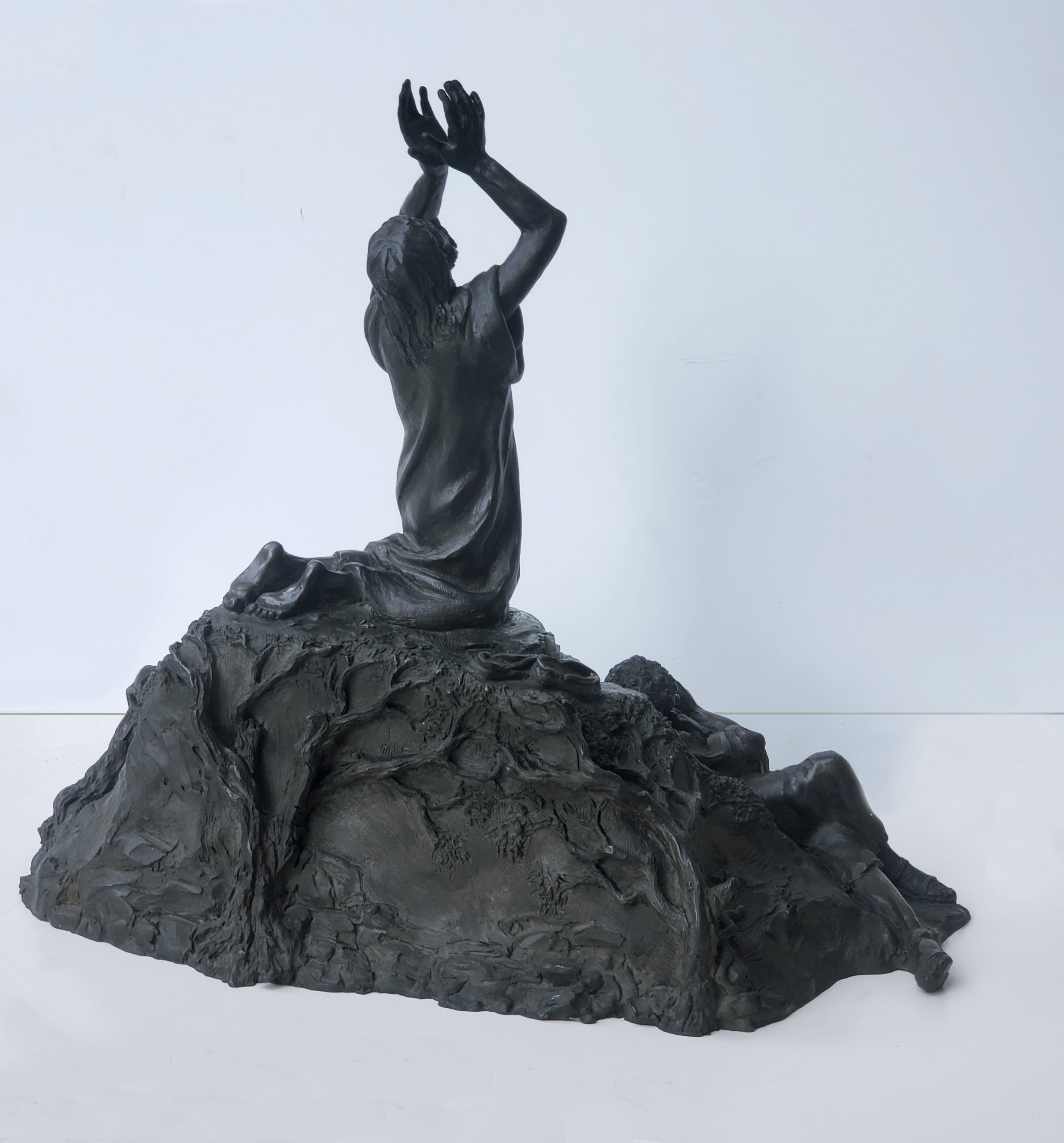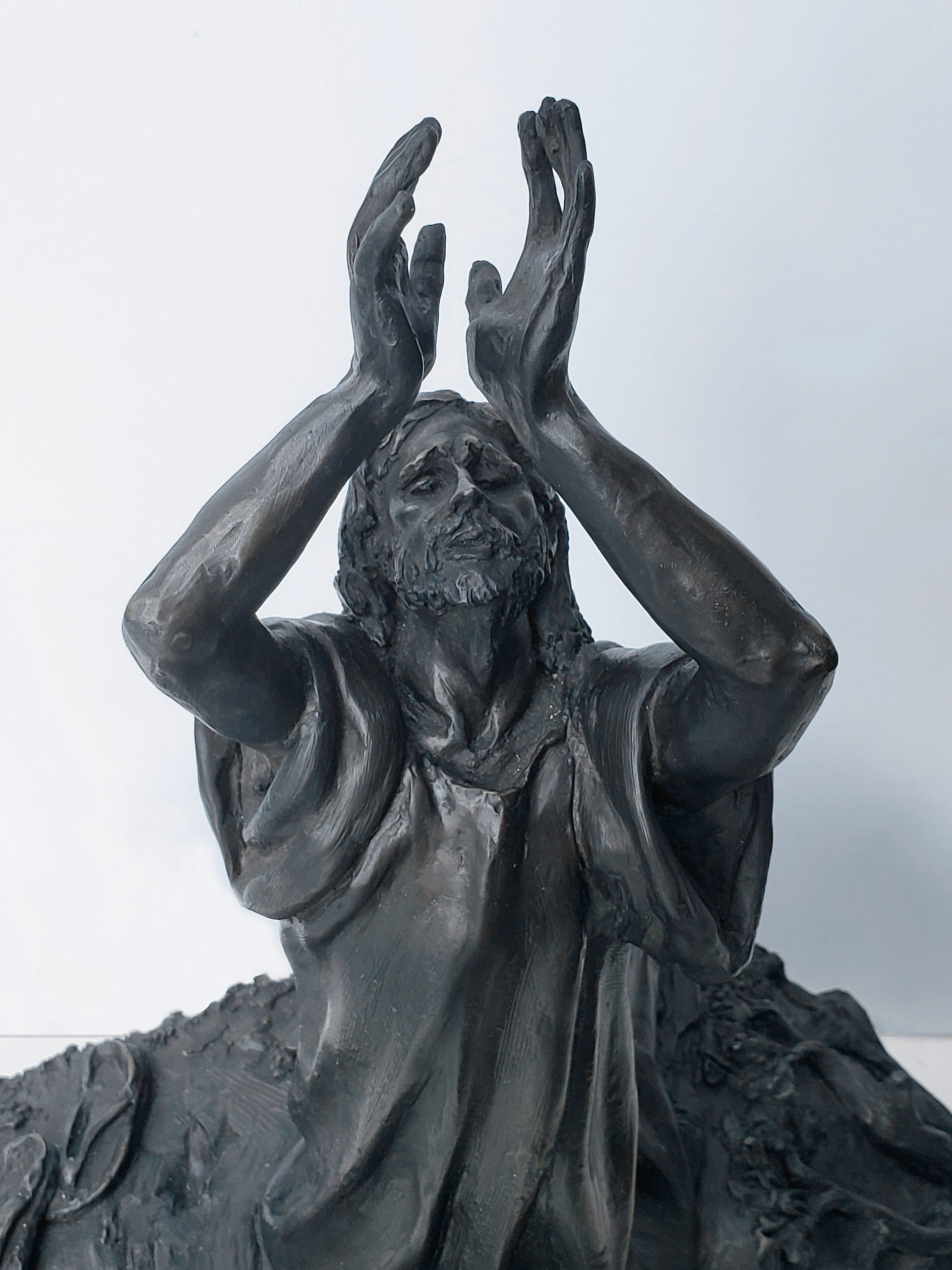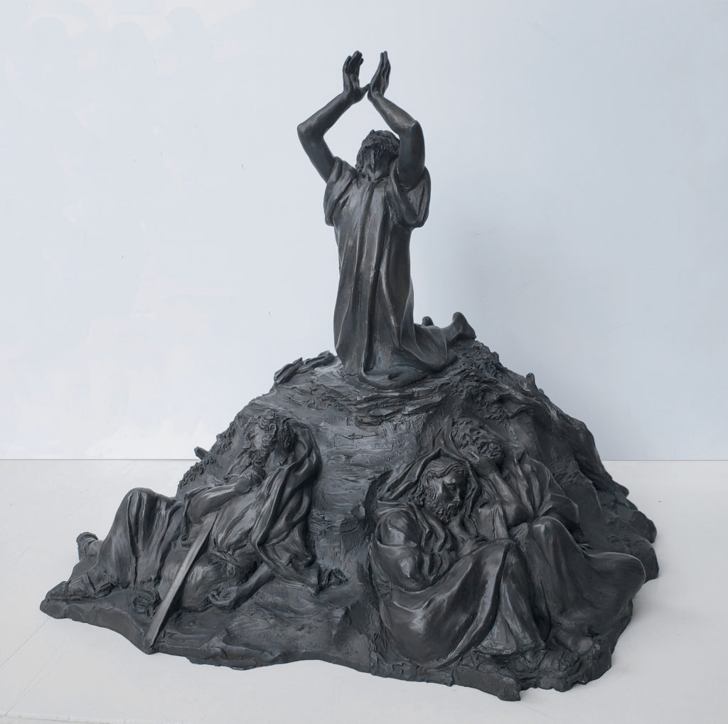 "This is the model for the over-life-size sculpture group that was created for Mater Dolorosa in Altadena, CA. Although "Agony in the Garden is the title given to depictions of Jesus praying on the Mount of Olives, the Passionist Fathers renamed this sculpture “Triumph in the Garden” after they saw this design. The upper register is the realm of transcendental prayer, and the lower register depicts Jesus’s words, “The Spirit is willing but the Flesh is weak."