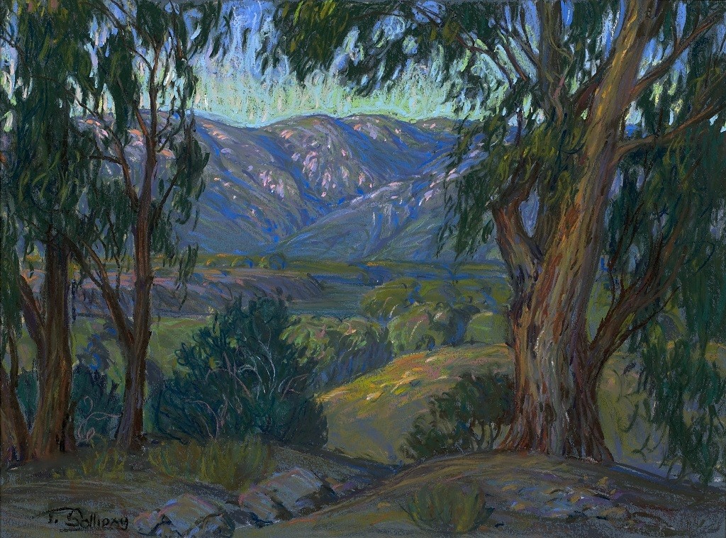 Description The painting was created near the artist’s home en plein air with the use of the pastel medium. The rich, deep color harmonies beautifully express a poetic California early evening sky. Solliday’s dynamic signature strokes are particularly distinct in his use of the pastel medium.
