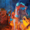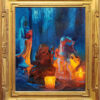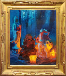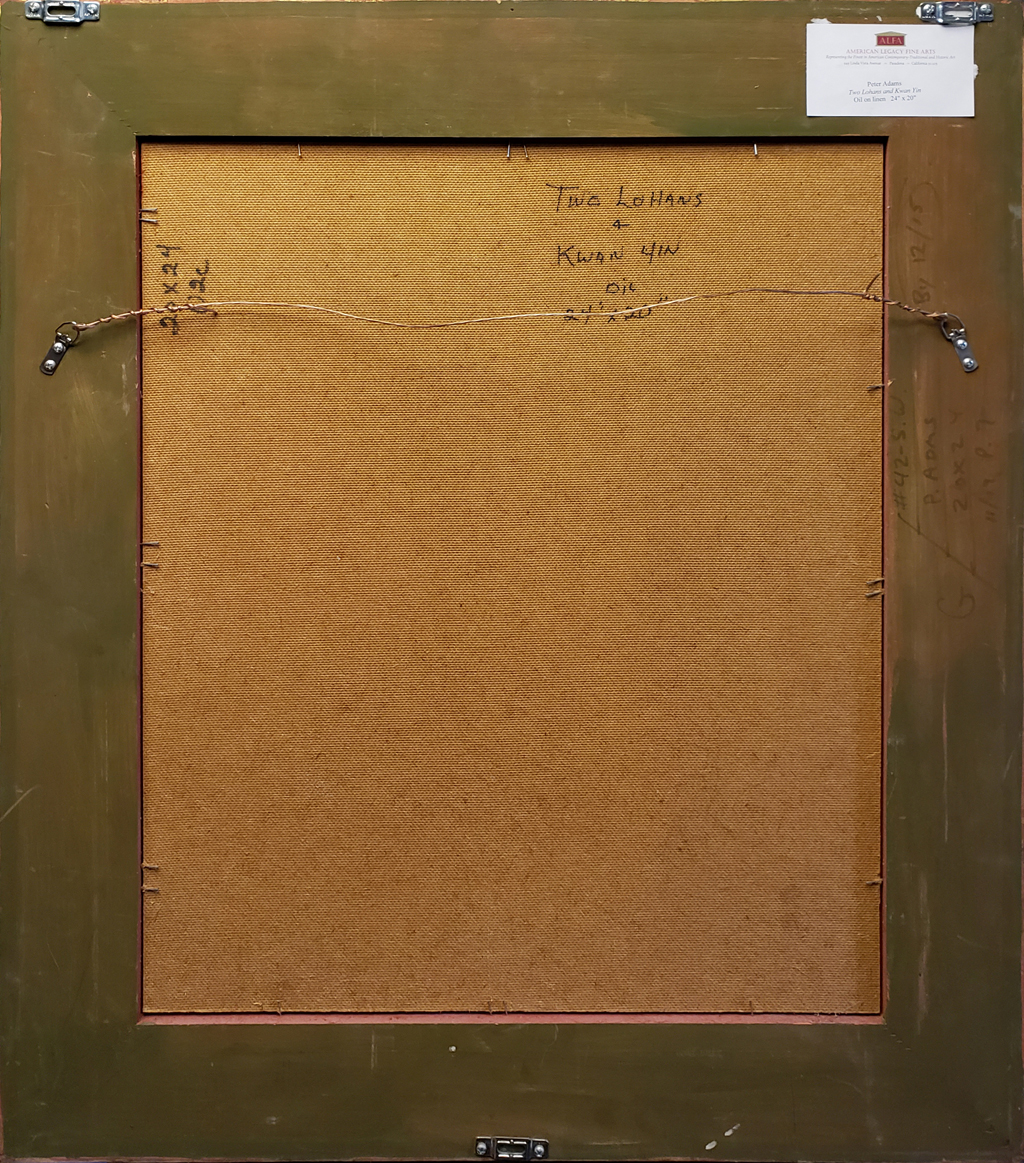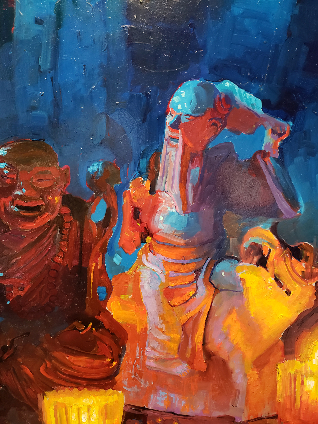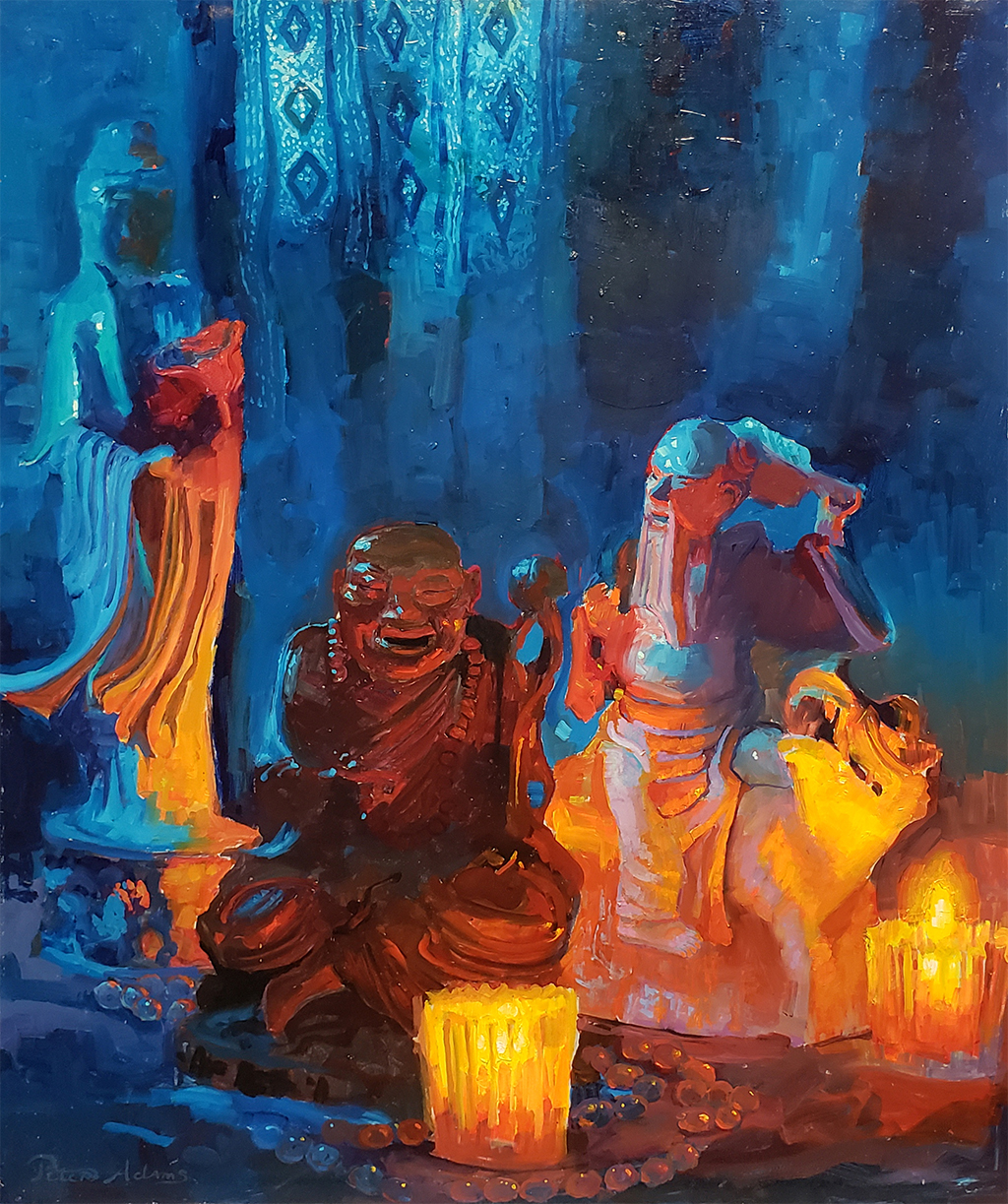 “Among my most memorable and profound travel experiences are the multiple extended trips I made through Asian countries, including China, Afghanistan, Pakistan, India, Bhutan, Nepal, and Tibet. Learning about local traditions and culture is part of my interest as an artist, and religious beliefs are integral to understanding the people. In this painting, I show three objects representing three different tenets of Buddhism. I have depicted them in dim light to suggest they are only half-realized in human experience. The foreground is lit by candlelight while a bluish moonlight shines from above to project a sense of mystery. The three tenets are compassion, represented by the standing porcelain figure of Kwan Yin; denial of the importance of this world, represented by the wooden meditating Lohan, Nakula; and conquering fear, represented by the porcelain figure of Lohan, Nantimitolo, as he is known in Sanskrit, who is confidently taming the dragon.”