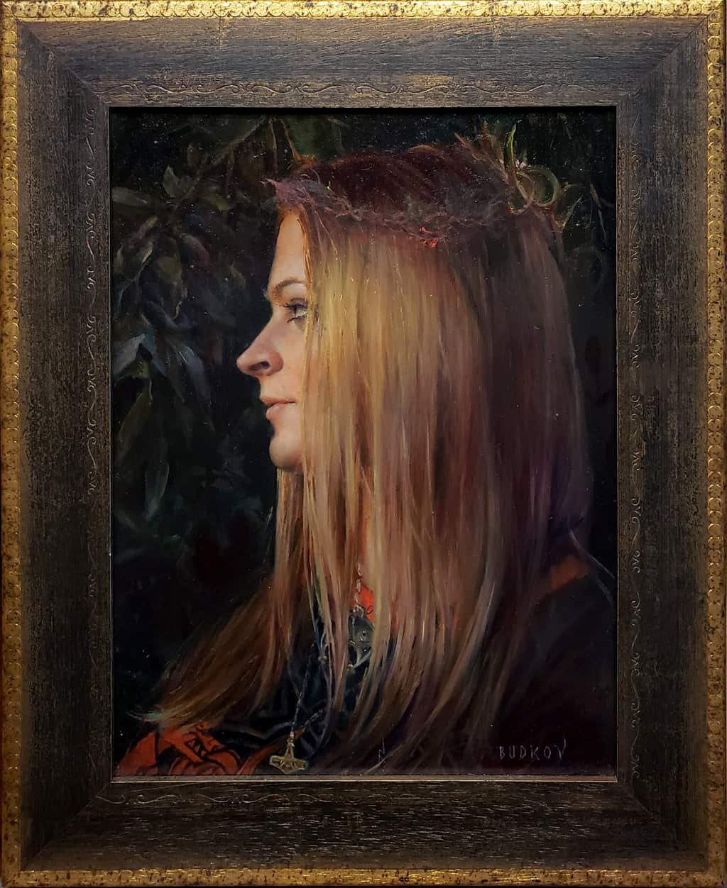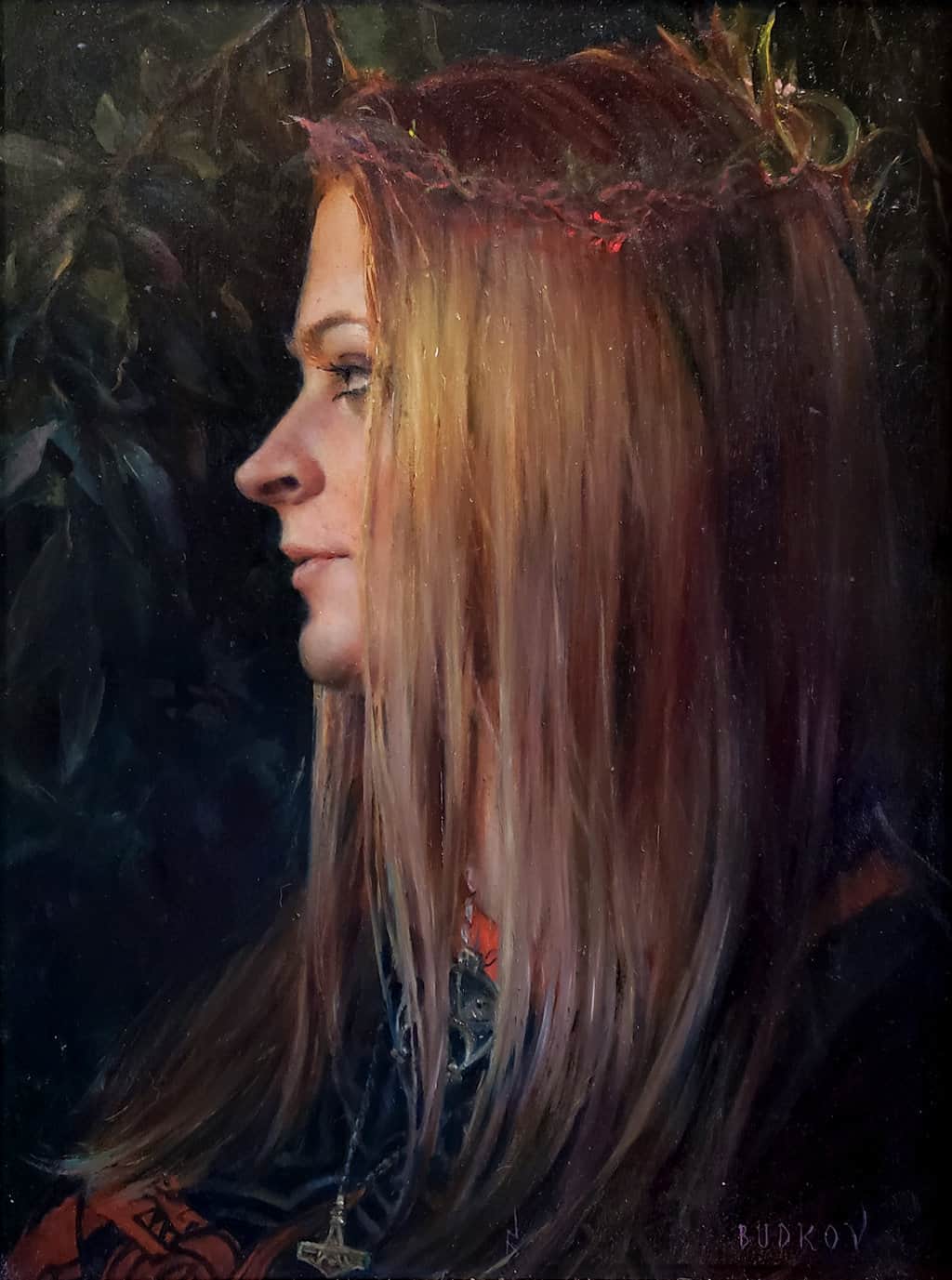 "This beautiful young lady wears a crown of red and green leaves; her blonde balayage hair reflects the twilight sun. She is dressed in clothes and jewelry influenced by Norse mythology. She is feminine, strong in nature. Ulver is the Norwegian word for wolves.”