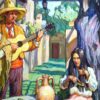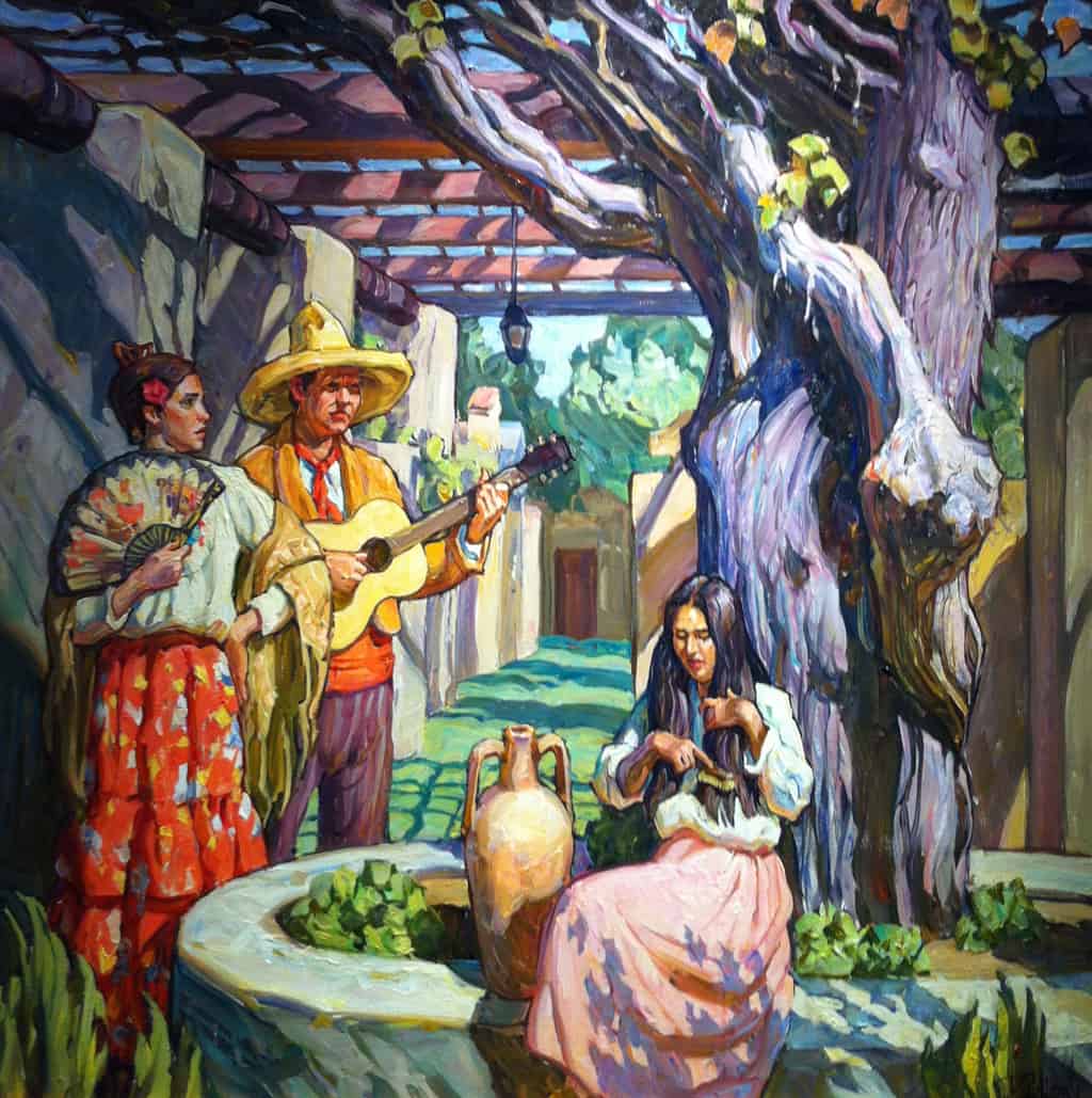 The painting was most likely painted during the days of San Gabriel Mission Fiesta, formally known as La Fiesta de San Gabriel, celebrated on Labor Day Weekend. Cultural, historic, and religious festivities coupled with live entertainment, a variety of international foods, and games make La Fiesta an unforgettable cultural event that has become a part of Mission San Gabriel Arcángel's history.