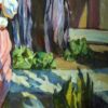 The artist used a vibrant mixture of red, yellow, green, purple and orange to create this lively painting.