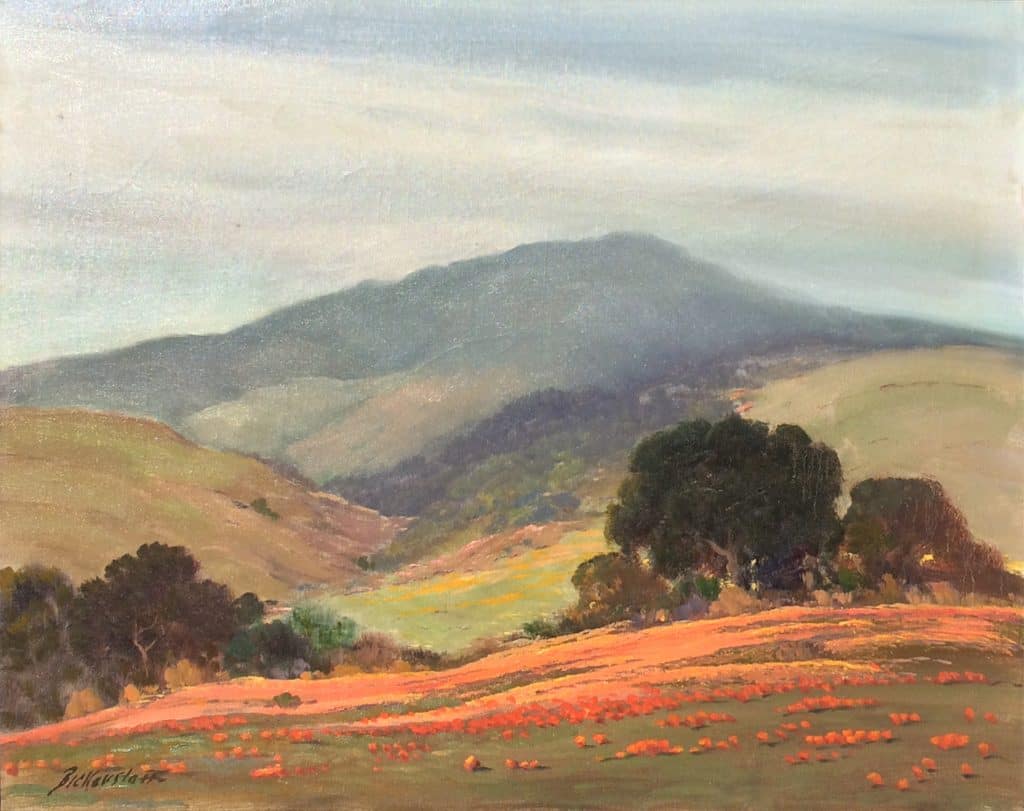Landscape painter, George Bickerstaff (April 12, 1893, Marianna, Arkansas - July 12, 1954, Ukiah, California) was primarily a self-taught artist except for a brief period at the Art Institute of Chicago. He led a peripatetic life before moving to California in 1922. His early years were spent in San Diego, Los Angeles, and Van Nuys. In the latter part of his life, Bickerstaff frequently exhibited with California landscape artist, Paul Lauritz. A prolific oil painter of mountain and desert scenes, his landscapes often include eucalyptus trees as well as California's rolling hills with fields of wildflowers. Occasionally, he painted seascapes, still lifes, and western and Indian genres. He was adept at promoting his own work and sold many paintings to hotels, hospitals, mortuaries, and rest homes.