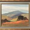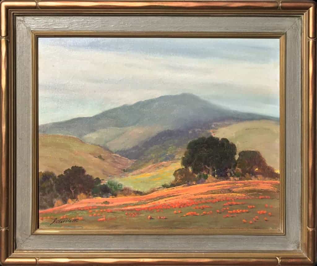 The painting is a classic Southern California plein air landscape scene depicting rolling hills with scattered oaks and fields of golden poppies. Bickerstaff's primary subject was of California's pristine landscapes. In fine vintage condition and original frame crafted by the artist.