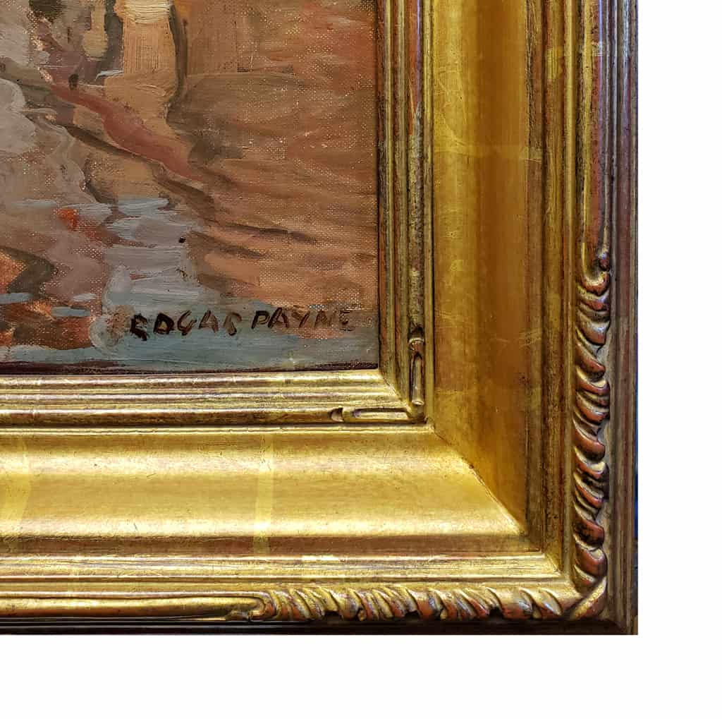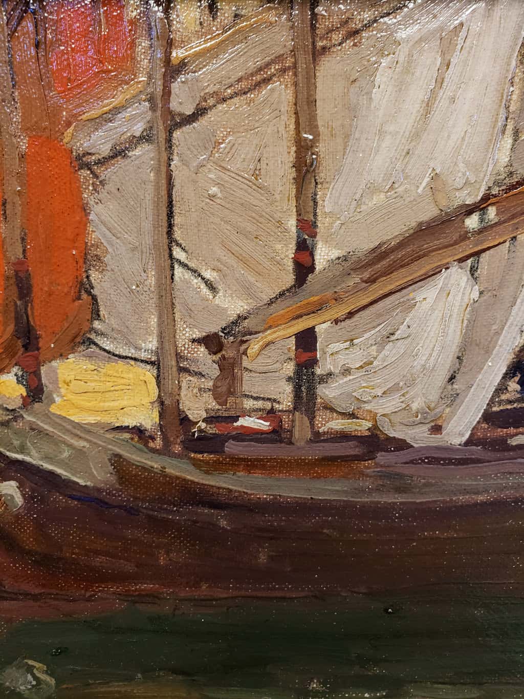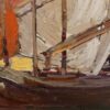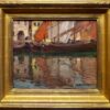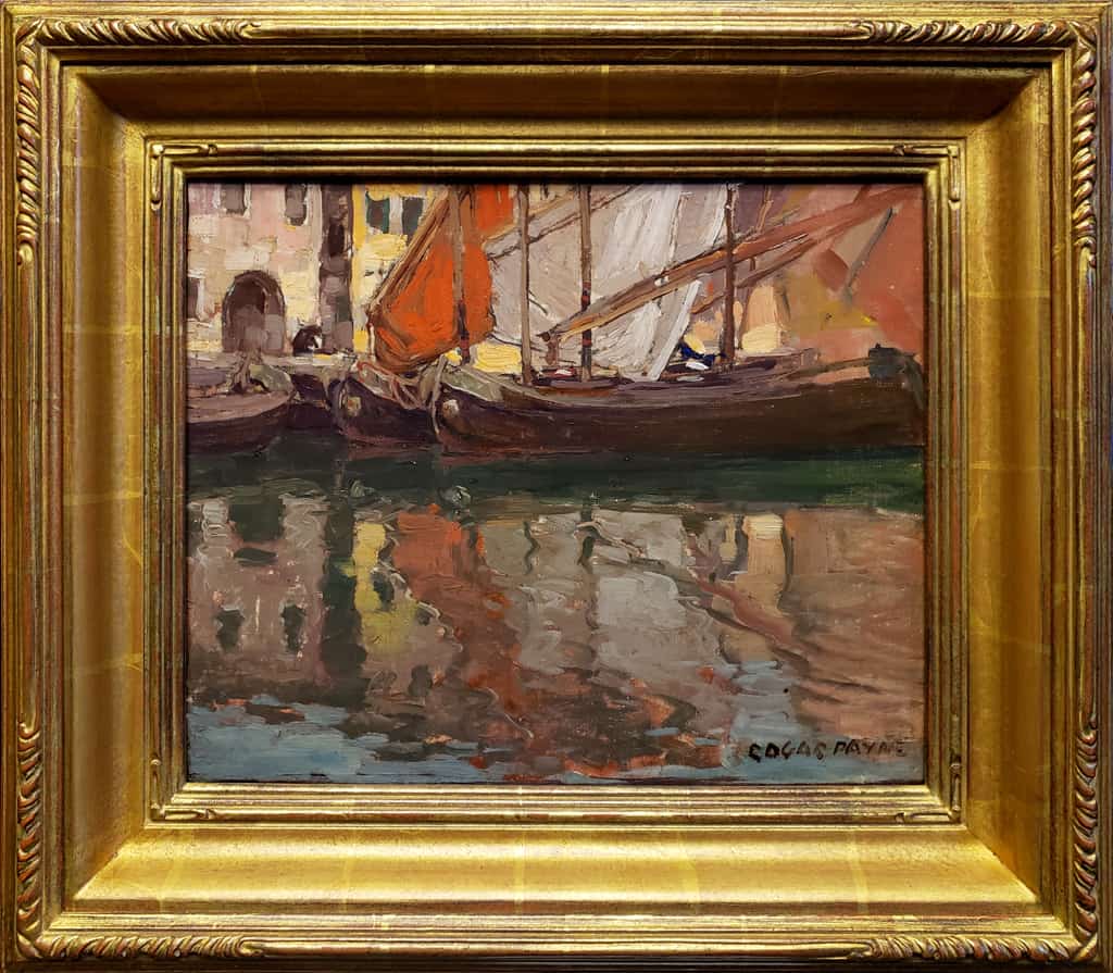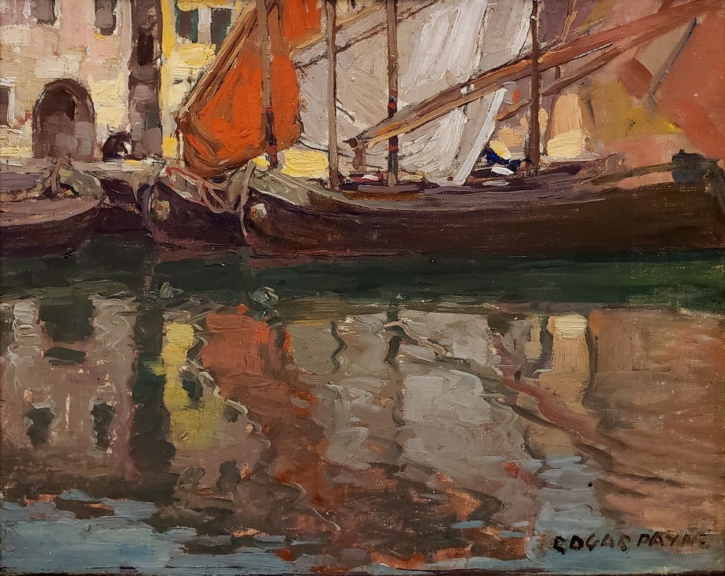 This oil painting of boats moored in a harbor, records a scene in the Italian fishing of Chioggia, where Edgar Payne sketched and painted sometime between 1922 and 1924. Payne made many larger, more finished works years later in California based on such loosely rendered oil sketches. However, this is a masterfully detailed plein air study revealing the sardine boats of Chioggia, distinct for their rust-color sails, lined up along a quay, with a village behind, and an abstract explosion of colour in the water reflecting the entire scene. Chioggia is situated on a small island at the southern entrance to the Lagoon of Venice on the Adriatic Sea and is often referred to as “Little Venice.”