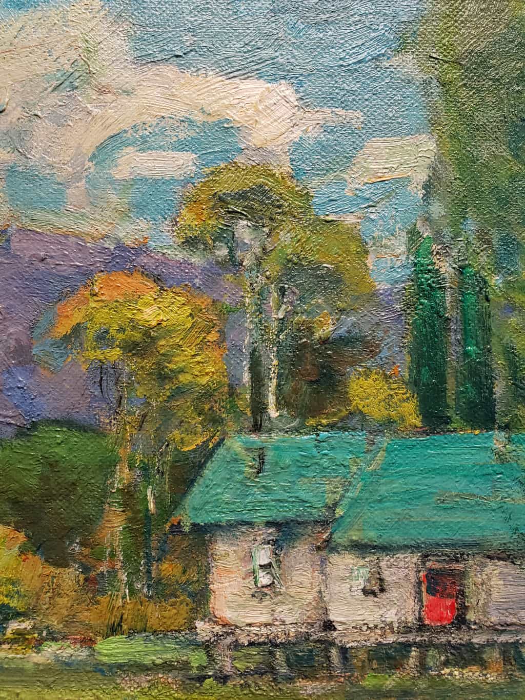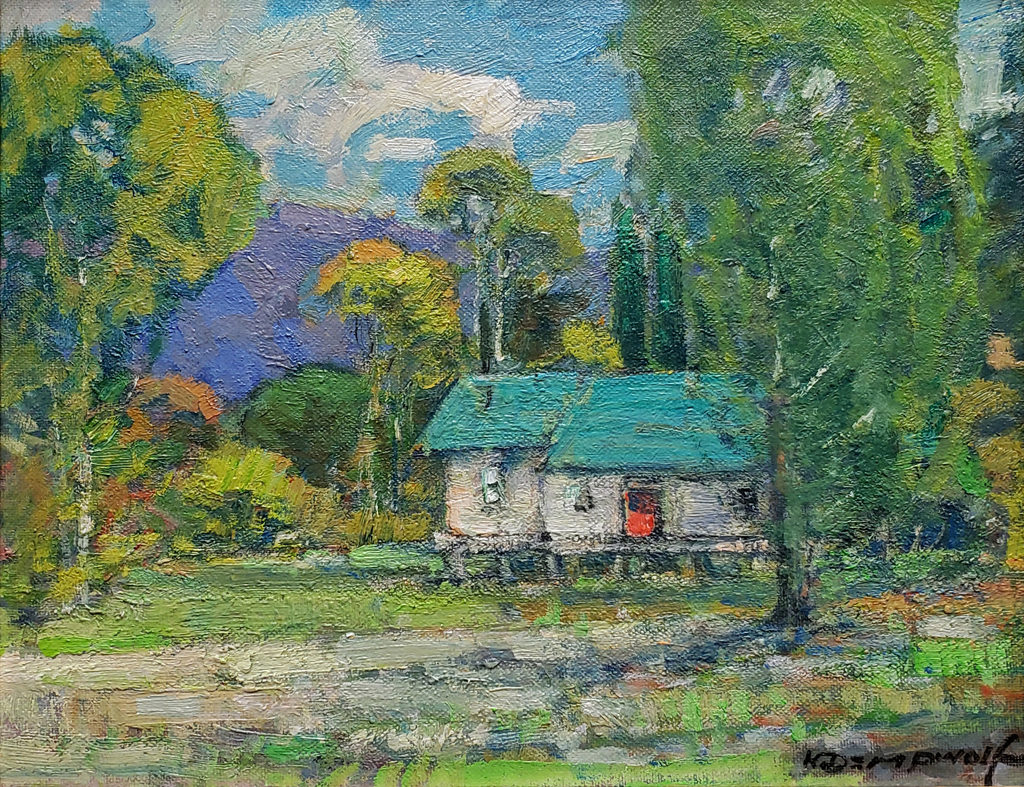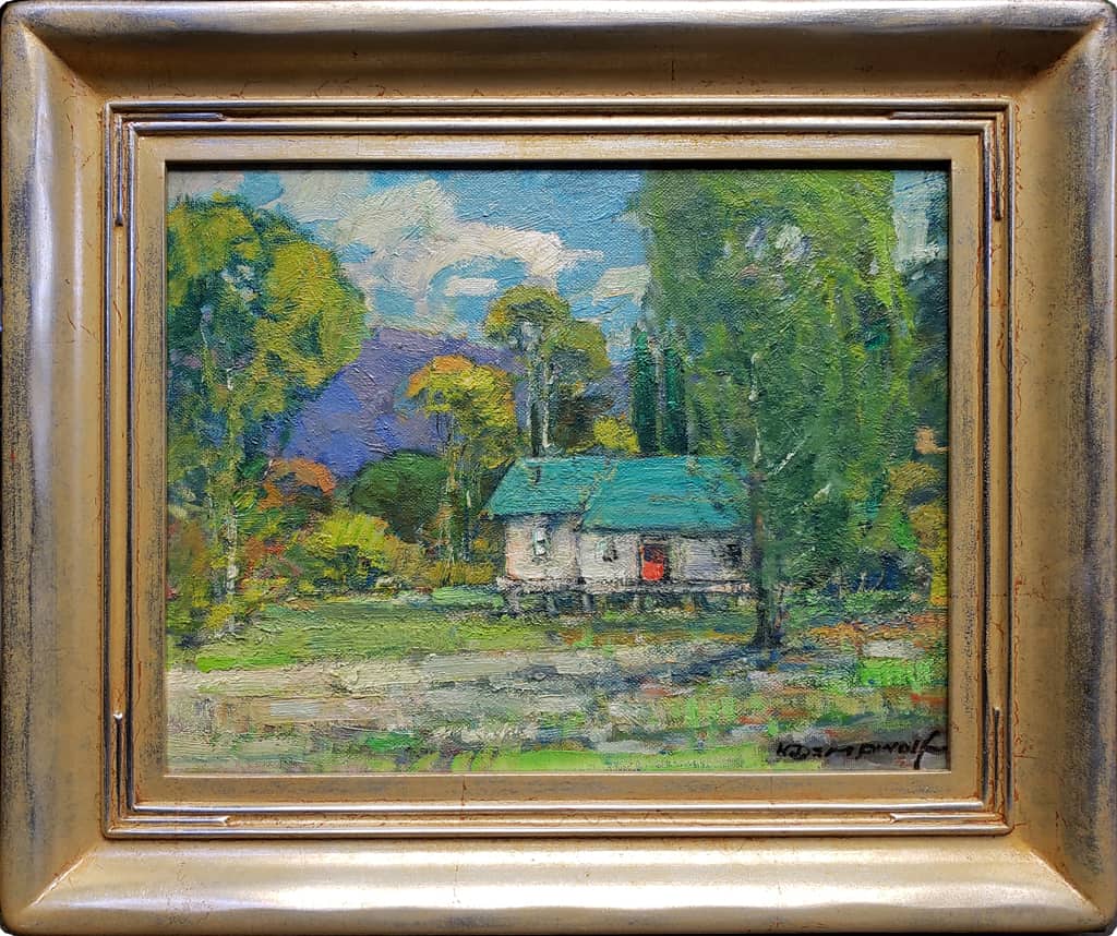 "In some parts of the Palos Verdes Peninsula, particularly the Portuguese Bend area, the earth has been moving and making it necessary for water lines to be flexible and above ground. Also, some homes are built on stilts to help keep them level. This home was vacant and being worked on up in the hills above where artists Dan Pinkham and Stephen Mirich live. Painting this area is like being in another world, painting unusual subjects everywhere—even houses up on stilts.”
