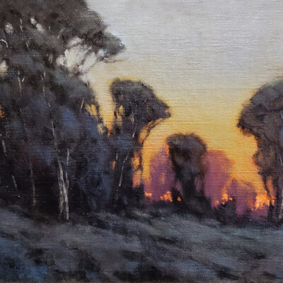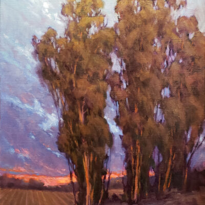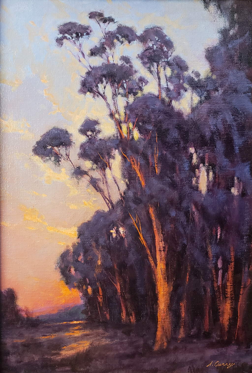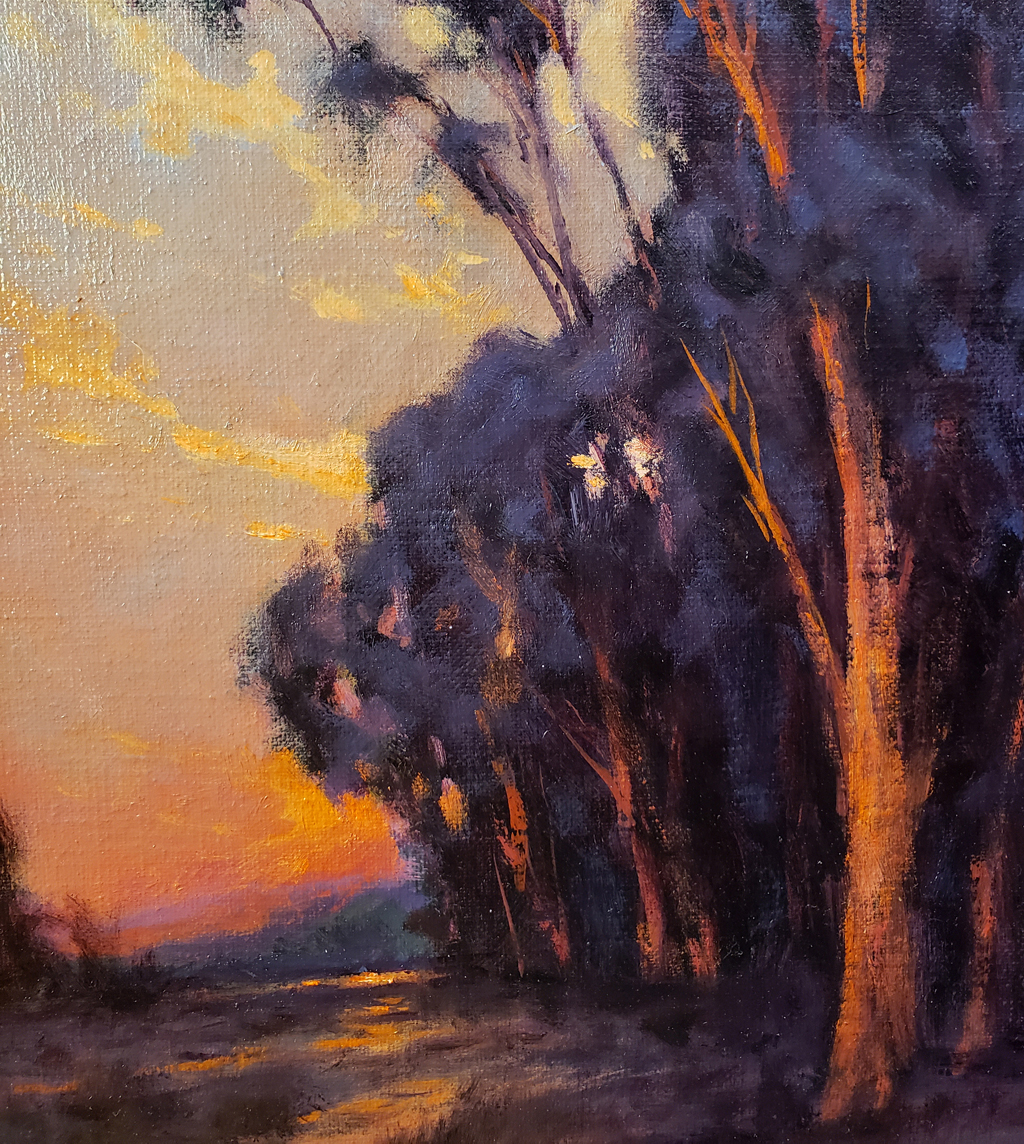 "The scene is from a friend's, 20-acre, horse property in Petaluma, Sonoma County, CA. Hard to believe these majestic Eucalyptus trees are not indigenous to the region, since they seem to be everywhere. Most of them were planted as windbreaks. The sun setting on a late September evening made for wonderful light and colors"