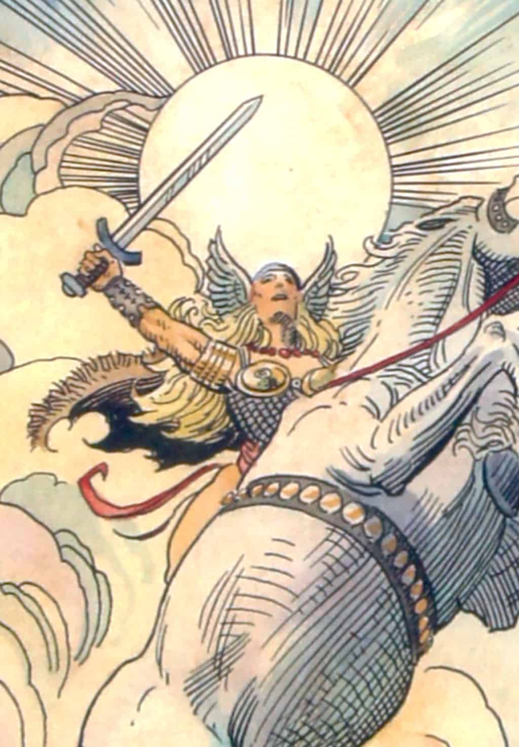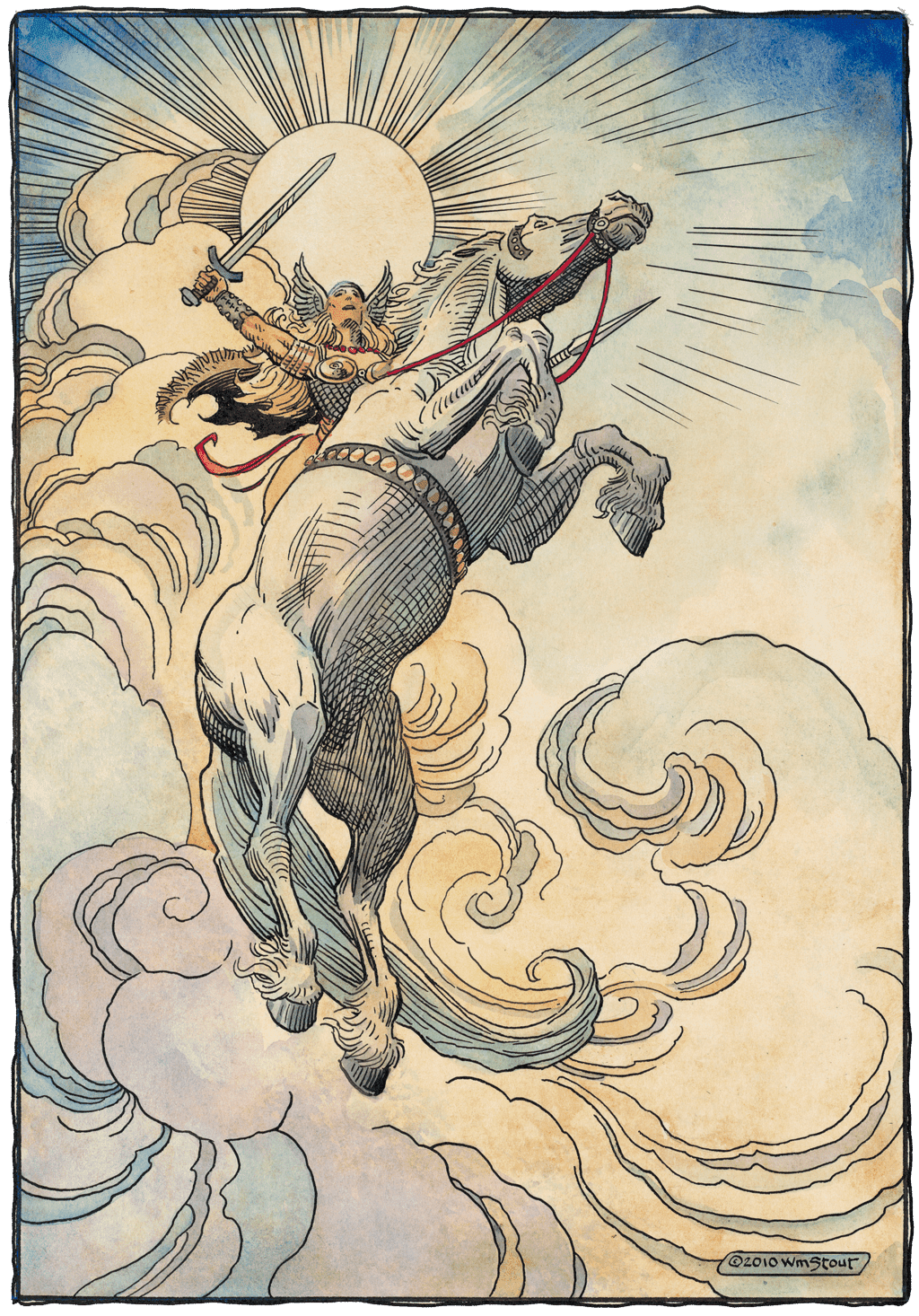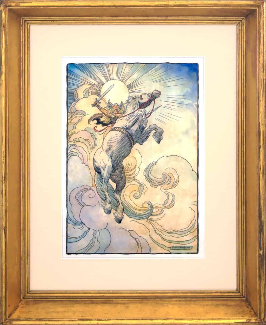 This magnificent work by William Stout was inspired by Richard Wagner’s four-part epic opera saga, "The Ring of the Nibelung," and was created as part of a collaborative art project in conjunction with the Los Angeles Opera's 2010 performance of "The Ring." The subject, is based on Norse mythology from the Medieval Poetic Edda and represents the story of a beautiful warrior maiden, a Valkyrie, who was cruelly deceived by her lover. William Stout is a multi-media artist who has won numerous awards for his artwork in pulp fiction, dioramas for natural museums, and film work, including two "Conan" movies, "Indiana Jones, Raiders of the Lost Ark," and "Pan's Labyrinth."
