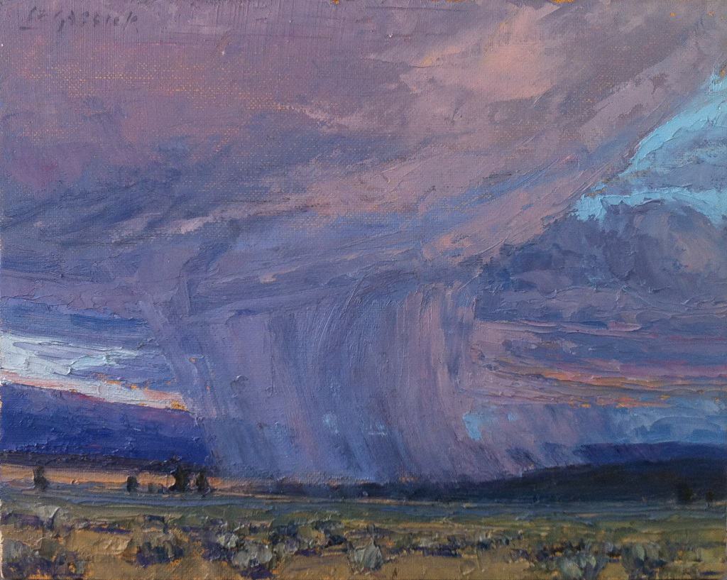 Surprise Valley showcases an abundance of untouched wilderness, waiting to be explored. LeGassick’s dramatic brushstrokes emphasize a sudden, violent localized storm looming above the swaths of land. The rich colors of blue and purple amplify the dramatic lighting in this scene.