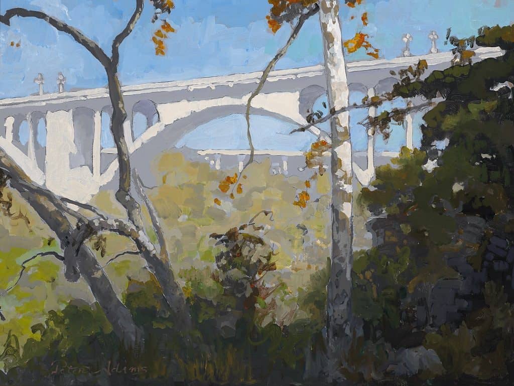 American Legacy Fine Arts presents "View of Colorado Street Bridge through the Sycamores" a painting by Peter Adams.