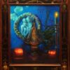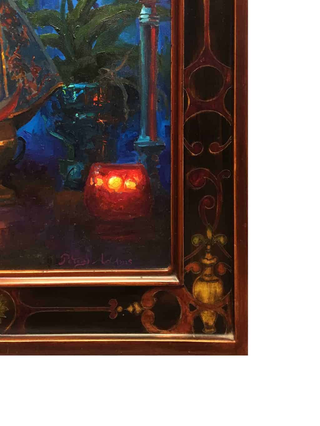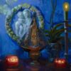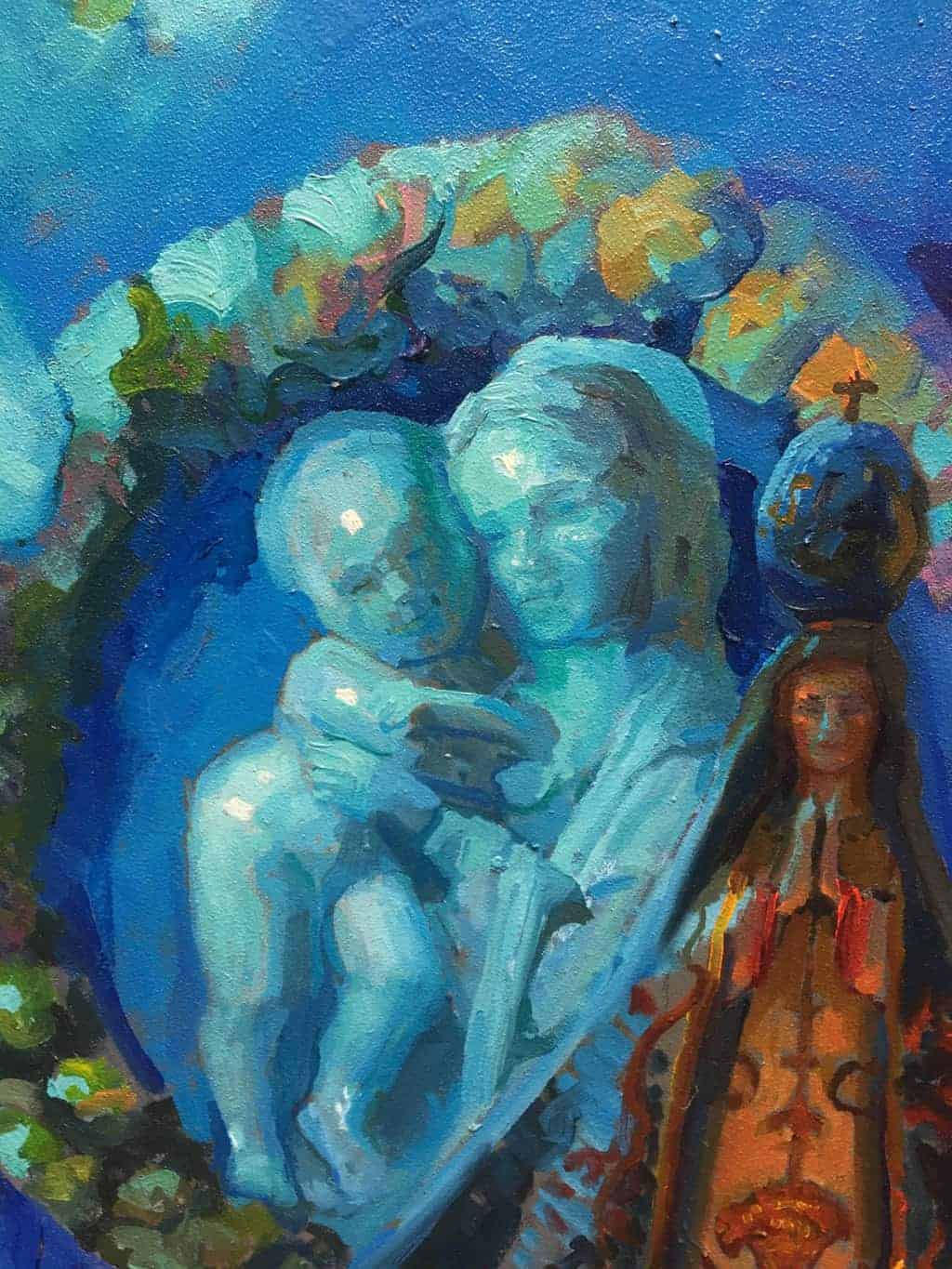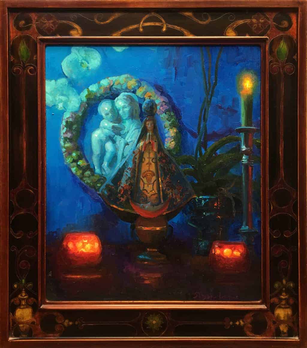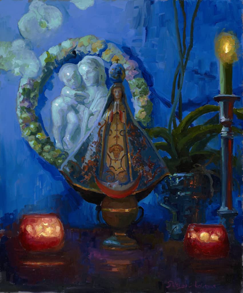 "In 1623 a miraculous healing of a Native-Mexican girl was attributed to the prayers of both of her parents made in front of this statue of the Virgin in the Mexican town of San Juan de los Lagos. In my painting I have bathed the still life in blue light that has the effect of moonlight. Two votive candles represent the prayers of the girl's parents. The Della Robbia in the background bespeaks of the Virgin's care for children while the flowers of the orchid symbolize God's overarching love for humankind."