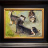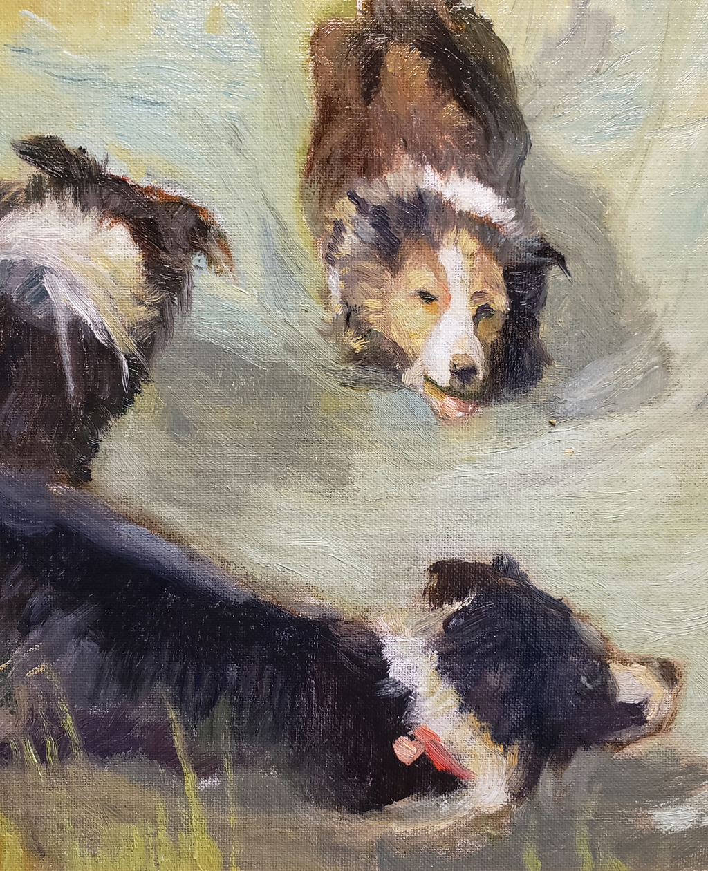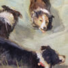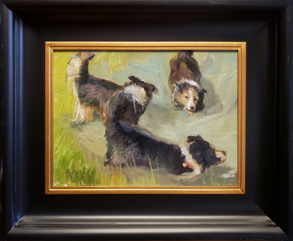 “After seasonal rains, the multiple holding ponds of Pasadena's great Hahamongna wash beckon visitors to a previously parched area of the Arroyo Seco. Water and dogs go redundantly well together! These particular Border Collie pups demonstrate their joy for an immersive event! A studio rendering based upon plein air notes.”