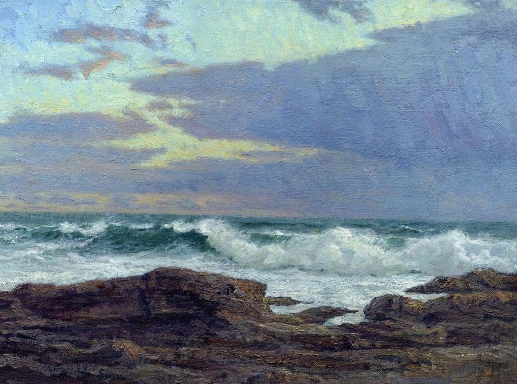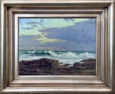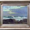 "When there is a 90 percent chance of rain moving in, most people want to be warm and cozy at home, but that’s when I’m running down to the beach to meet the weather head on to paint. As the sun began to set, the storm front moved in and was very apparent. The temperature dropped quickly, and as I applied my last quick brush marks across the canvas a cold rain began to fall. Climbing back up the trail from the beach in the rain came the satisfaction of having enjoyed a beautiful moment of nature."