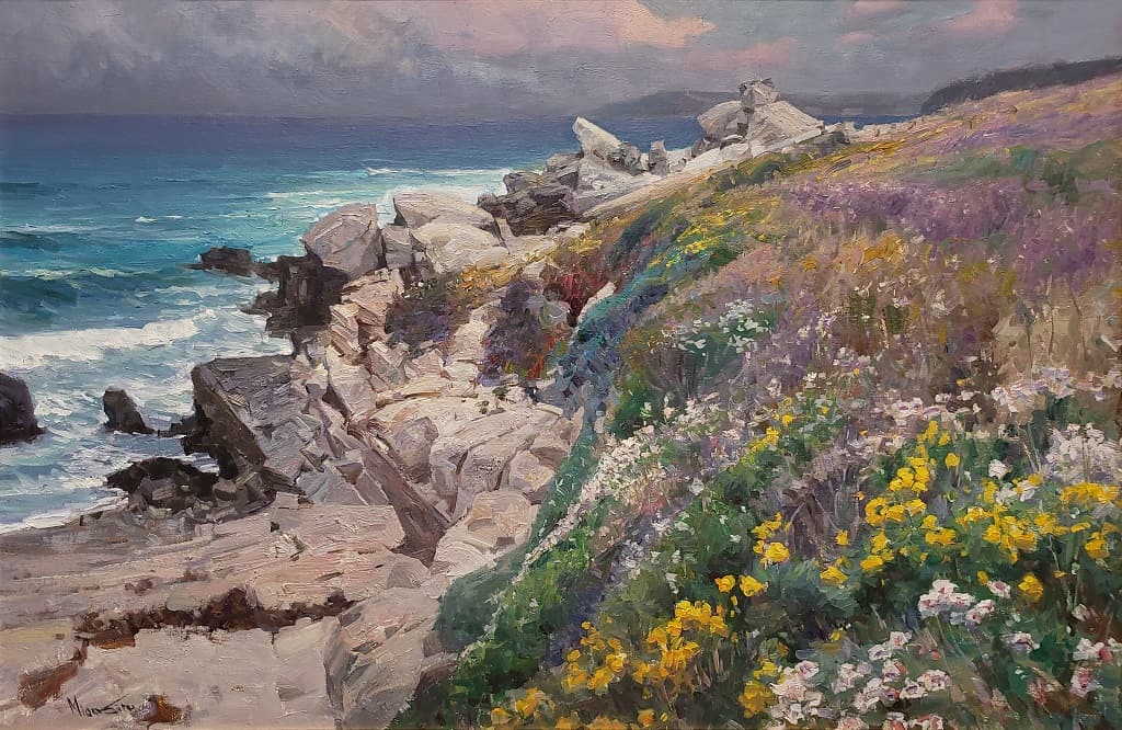 Elements of nature burst into life in this vibrant painting of Carmel’s coastline by Mian Situ. The delicate groupings of California wildflowers are contrasted by the perilous rocky shoreline, expansive sea and impending storm clouds. The artist shares with the viewer a sense of humbling power and beauty.