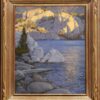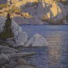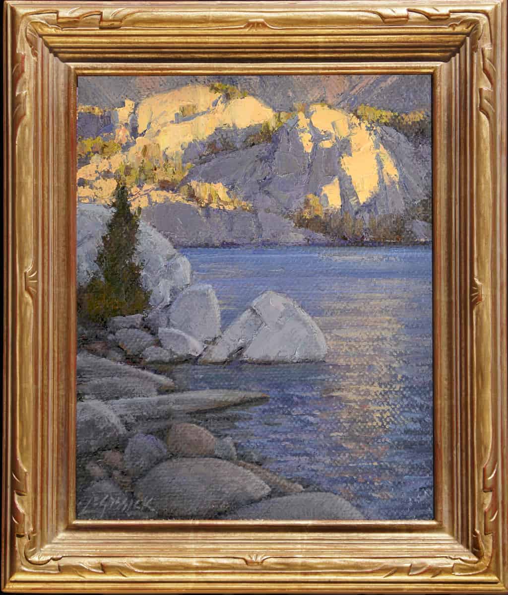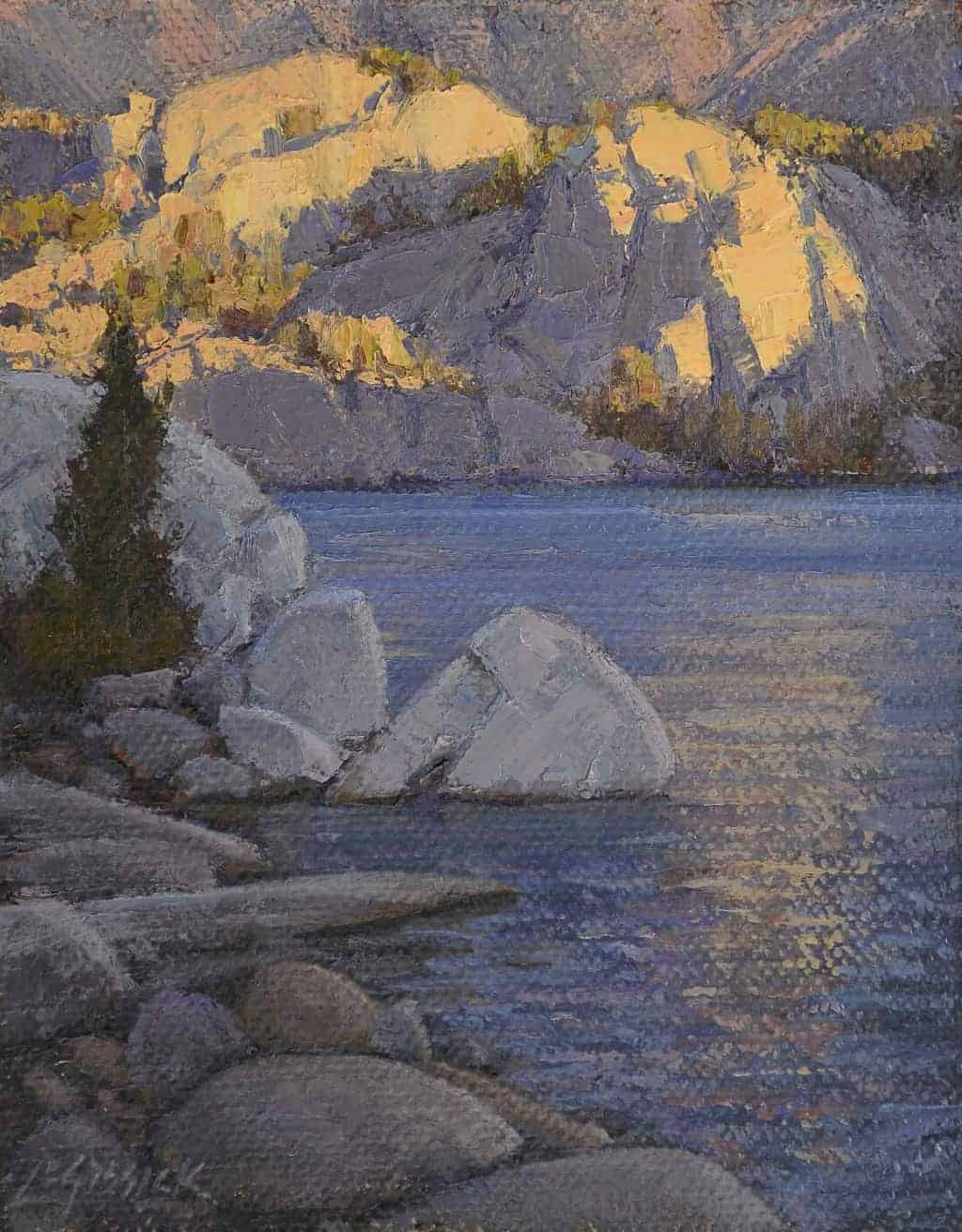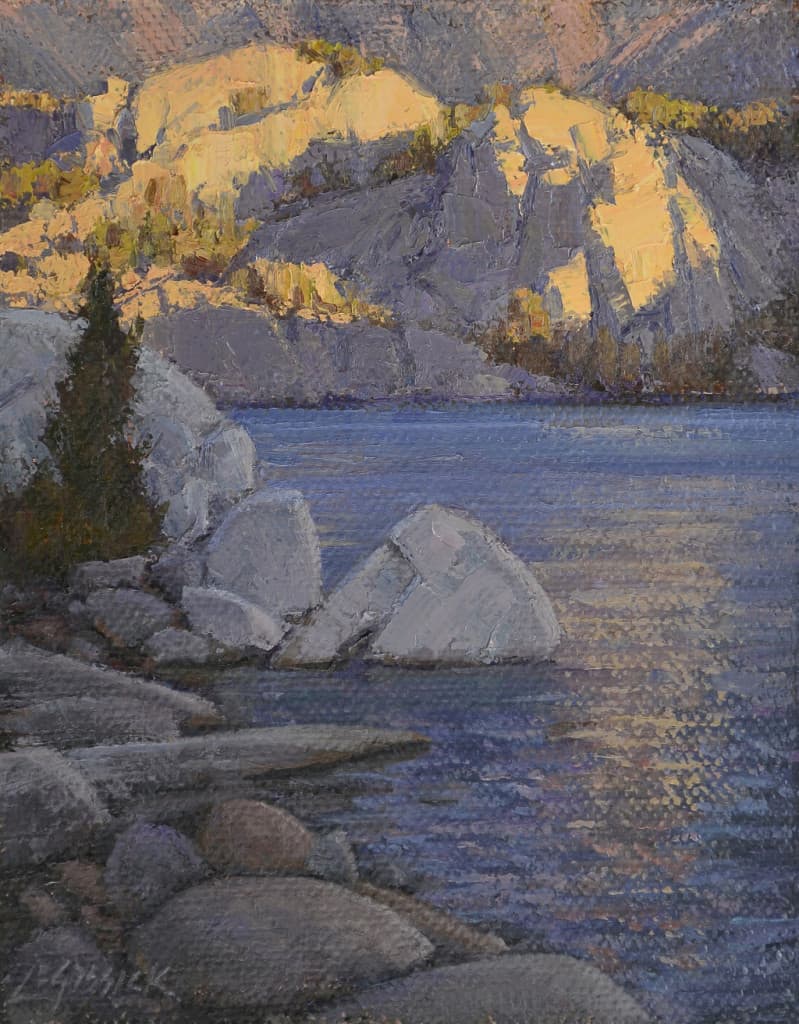 “On one of my many mule-pack trips into the John Muir Wilderness of Big Pine Canyon, I got up very early on our last day to paint a little 8x10 study of first-morning sun on the outcrop across Fifth Lake. It was a fast and furious little study, very crude because we had to pack up camp that morning. It sat in my study pile in my studio for years, and one day I pulled it out and realized I had really captured the feeling of light, despite the roughness of the painting. So I worked up this 14x11 piece; I made it vertical because I wanted the cool dark, shadowed part to lead you up to the grand finale-- that glowing, warming, welcoming sun on the rocks!”