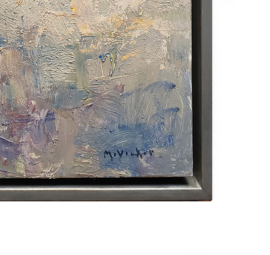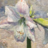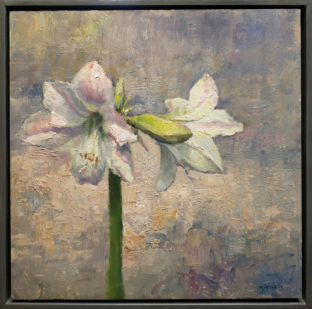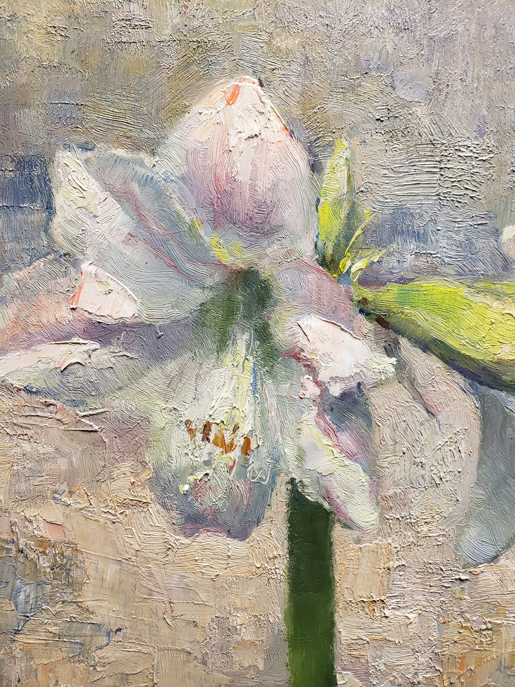 “White Amaryllis’ was intentionally painted with the focus on just the flower and wall. I wanted this piece to capture the atmosphere and air that I was seeing within a very shallow space. All the grey and white tones had a lot of appeal to me while trying to make the white amaryllis pop against a mostly white wall.”