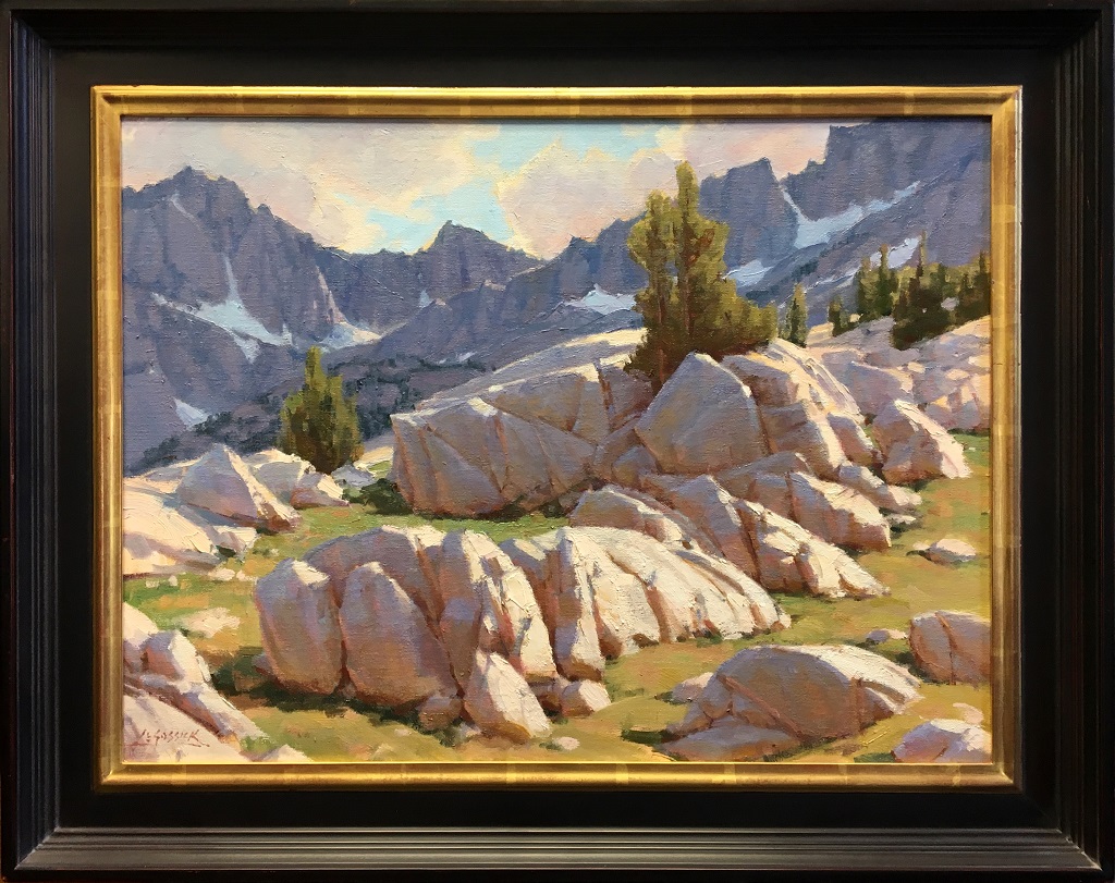 "This painting began from studies made while on a mule pack trip to the High Sierra. We camped at Hungry Packer Lake in the John Muir Wilderness. I was struck by how white the granite was in this area. John Muir called the Sierra the "Range of Light" and these stark but beautiful rocks certainly do shine."