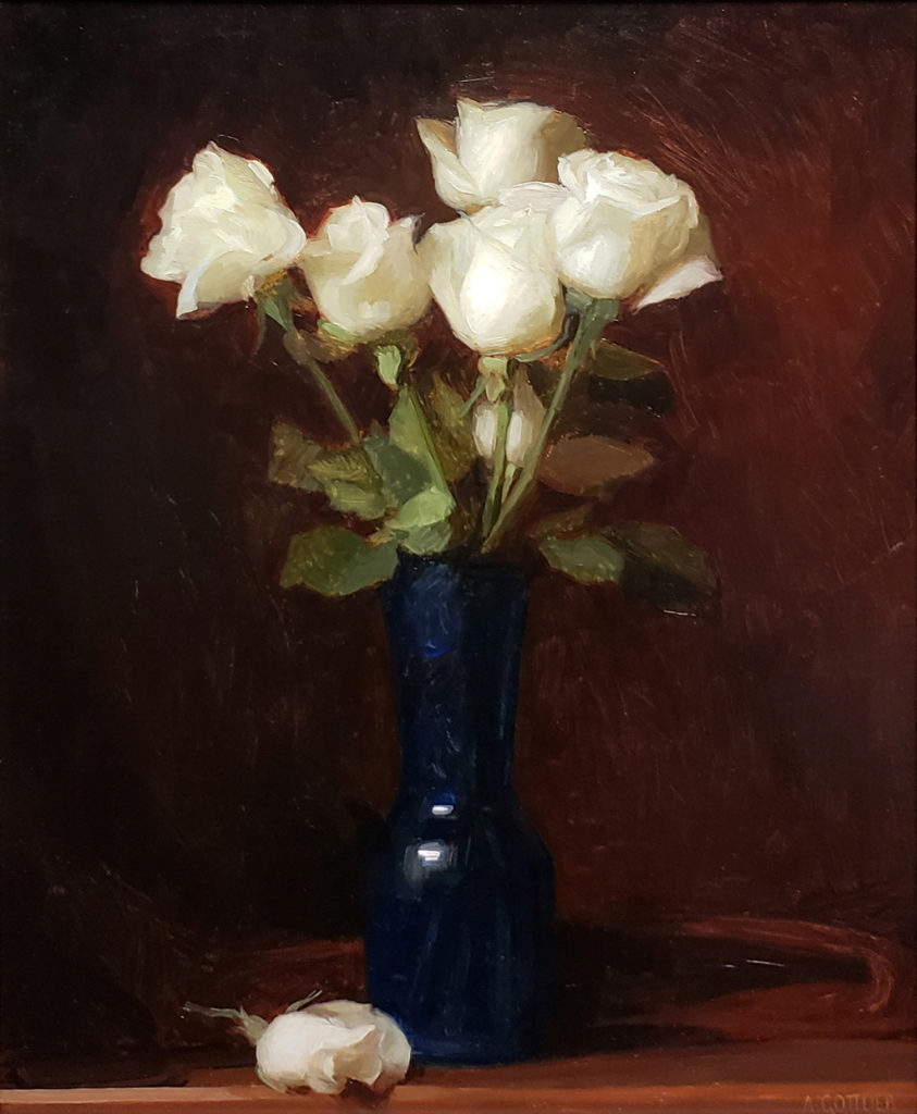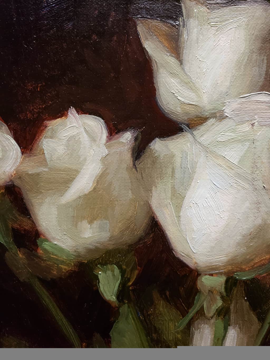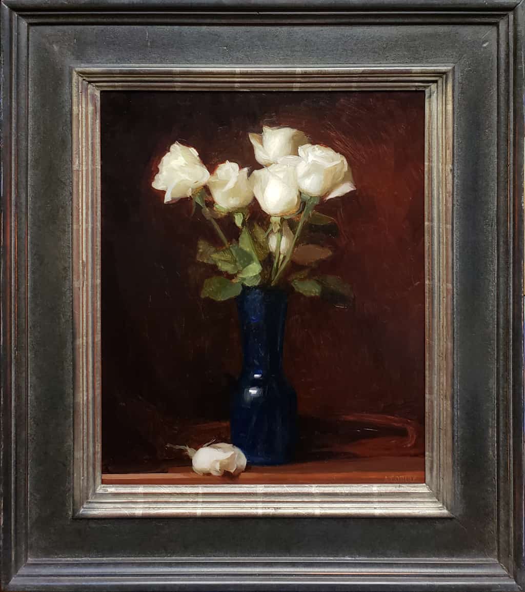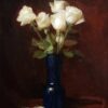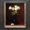 Description Sublime, calming and elegant, this simple bouquet of white roses symbolizes a fresh beginning. The dramatic chiaroscuro effect in this oil painting accentuates the delicate detailing of the soft white petals. The reflective light on the cobalt glass vase adds a sudden spark of life.