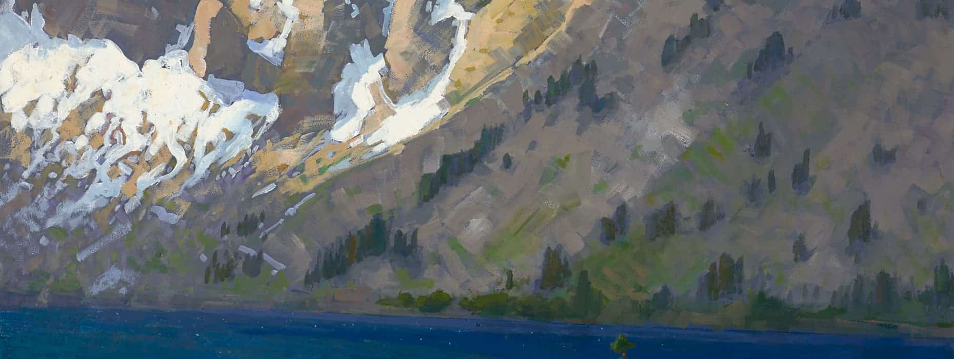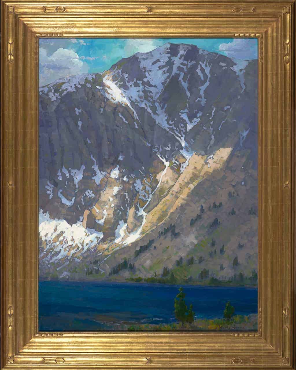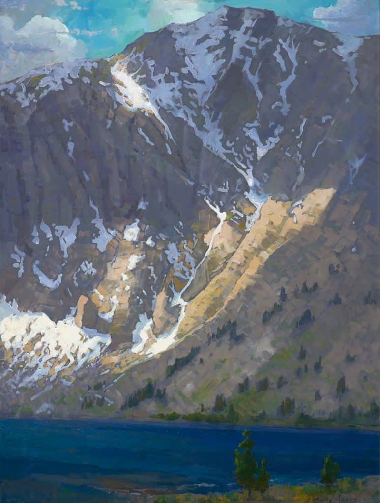 "I am always humbled by the magnitude of the Sierra Nevada Range with its monumental mountains towering over lakes and pines. Convict Lake is a particular favorite place of mine to paint. What interested me in this scene, here in late spring, was the contrast between the immobility of Mt. Morrison at 12,276 feet and the shifting clouds and windswept waters of the frigid lake."