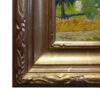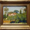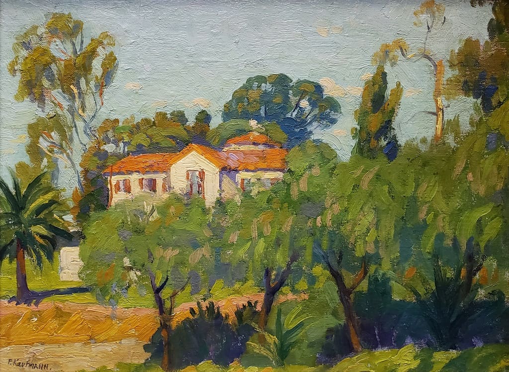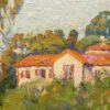 The painting represents a lovely 1920s red-tiled Mediterranean-style home nestled in the middle ground within a sunny Southern California landscape surrounded by various green trees, including palm, eucalyptus, and cypress, among others. Except for a few small white clouds, the sky is clear and has a beautiful light blue color that adds to the inviting setting. The location may be in Pasadena, where the artist frequently painted. The brushwork is loose and painterly, and the colors are vivid. Based on the artist's impressionistic style and the size of the panel, the painting was most likely created en plein air.