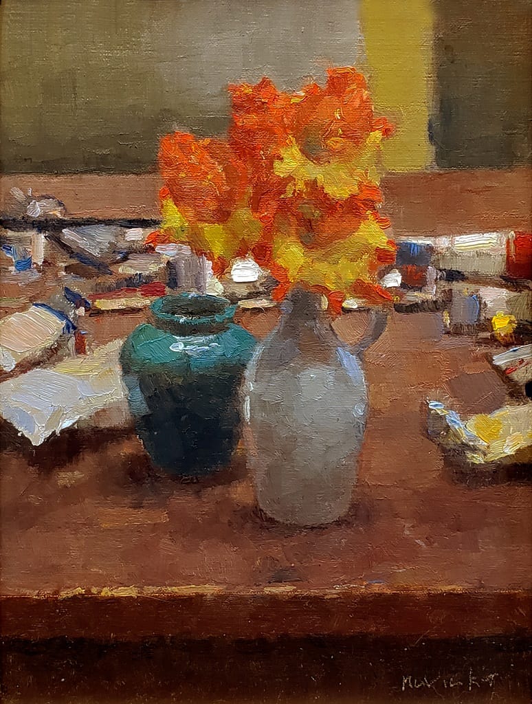 "The gladiolus were clipped from our garden, brought into the studio and set upon my table mostly covered with paint tubes. I liked the casual informal appearance, flowers with paint tubes, made some adjustments and painted what I saw." — Jim McVicker