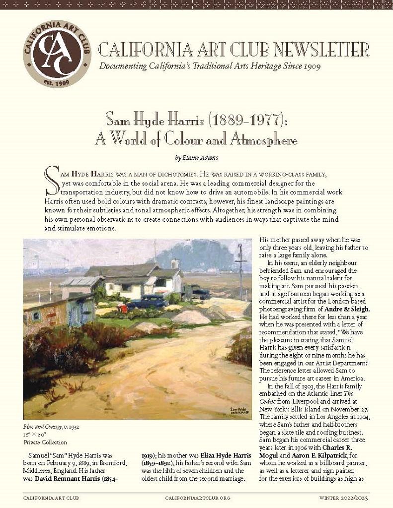 Sam Hyde Harris (1889-1977) – A World of Colour and Atmosphere By Elaine Adams, CAC Newsletter Winter 2022/2023 Post navigation Previous: Sam Hyde Harris (1889-1977) – A World of Colour and Atmosphere By Elaine Adams, CAC Newsletter Winter 2022/2023